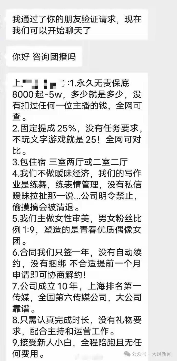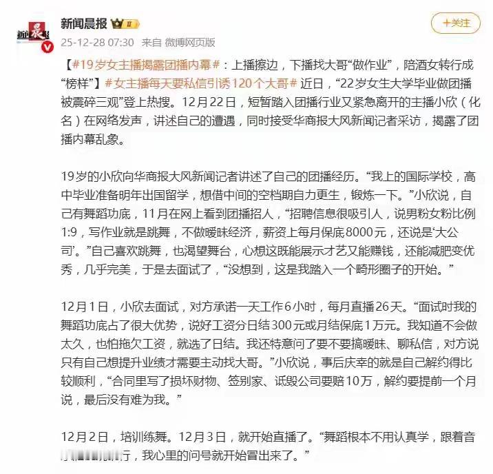 上海19岁准留学生亲历直播修罗场:日撩120位“大哥”的KPI,撕开千万打赏背后的情感屠宰场与26元工资条 (来源:综合自网络公开报道、当事人访谈及行业内部披露) 当夜幕降临,无数直播间亮起绚烂的灯牌,歌声舞影背后,一场精密计算的情感收割正在无声进行。近日,一位19岁上海准留学生小欣的短暂从业经历,像一把锋利的手术刀,划开了直播行业光鲜的肌理,露出内里冰冷残酷的运转齿轮。这里没有梦想舞台,只有写满“日撩120位大哥”的KPI表格,和最终到手仅26元的荒诞工资条。 怀揣利用留学空档期自力更生的简单愿望,小欣被一则“男女粉比例1:9”、“写作业就是跳舞”、“月保底八千”的招聘广告吸引。面试时信誓旦旦的“不涉暧昧”,在她踏入所谓“大公司”的那一刻起,便成了最讽刺的谎言。工作从傍晚五点开始,直播常常被迫延续至凌晨三点,下播时间不由时钟决定,而取决于是否有“大哥”豪掷千金“接下班”。 真正的煎熬始于镜头关闭之后。公司强制的“写作业”,竟是每日至少向60位陌生男性发送私信,对于无业绩的新人,数量翻倍至120位。这并非简单问候,而是需要研究对方头像、所在地后,进行“个性化”的撩拨与引诱。小欣必须学会在充斥露骨言辞的信息中“拉扯、迂回”,唯一目标就是哄骗对方进入直播间消费。舞蹈才艺?那不过是背景板。 更令人脊背发凉的是其系统性的剥削本质。主播被迫签下“合作协议”而非劳动合同,其中隐藏着数十万的天价违约金陷阱,完美规避法律监管。职场内,主持人为抽成公然辱骂、精神压迫,同事间为抢夺“大哥”资源互相倾轧、造谣生事。所谓高薪,实为画饼,小欣工作近月仅得千元,另一位26岁女生小羽,在倒贴房租后,当月净收入仅为26元。 这场闹剧的核心,是一场针对孤独感的规模化围猎。运营团队深谙人性弱点,编写标准话术,将主播训练成情感投射的容器。屏幕那端的“大哥”们,消费的并非才艺,而是被精心制造出的虚假亲密与情绪价值。当“陪伴”和“暧昧”被明码标价、拆解成流水线作业,情感便成了最廉价的商品,而主播与观众,都沦为了这套畸形算法下的双重囚徒。 小欣的逃离与揭露,引发了山呼海啸般的共鸣。人们愤怒于无良机构的欺诈,更震惊于情感剥削竟能如此工业化、常态化。这记警钟,不仅敲给那些怀揣明星梦的年轻人,也敲给每一个在虚拟世界中寻求慰藉的灵魂。当打赏按钮被轻易按下时,我们是否看清,自己是在为真诚喝彩,还是在为一场精心编排的幻觉付费? 行业的自我净化与平台的严格监管已刻不容缓。必须斩断“代聊”黑产,设立打赏冷静期,用法律铁拳砸碎那些欺诈合同与违约金枷锁。更重要的是,我们需要一场关于网络情感消费的集体反思:如何在数字时代,建立真实、健康的人际联结,而非坠入被资本精心设计的感情真空。 直播乱象 情感陷阱