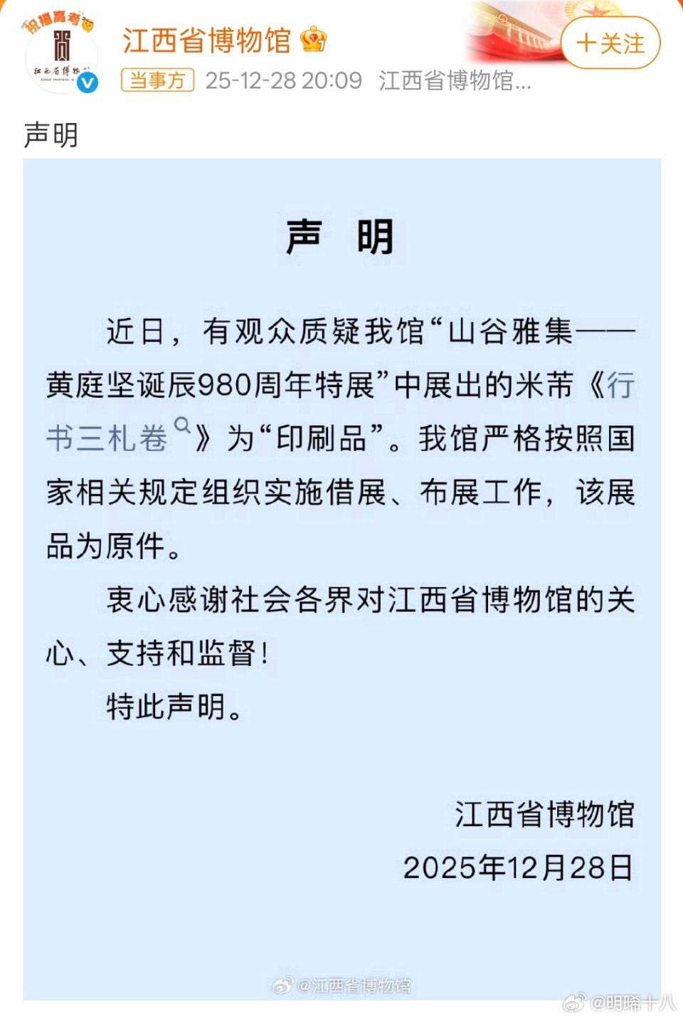 网友质疑,江西博物馆展出的《米芾三札》为假货!江西博物馆称是从故宫博物院借的,