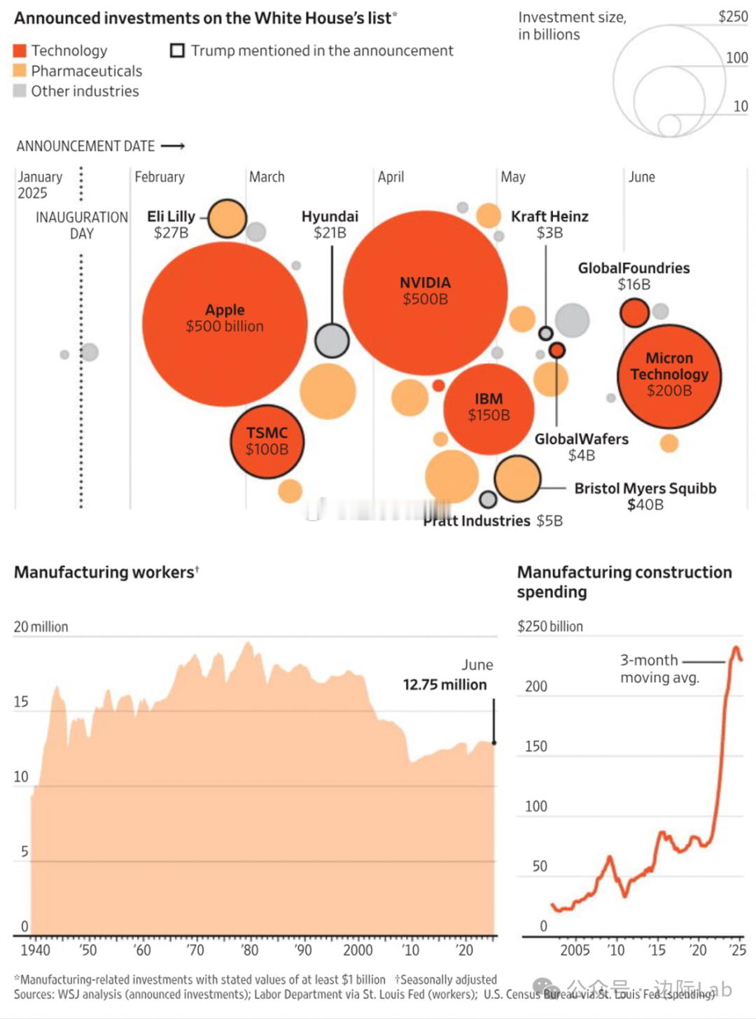 美国白宫正积极宣传其政策已促成近2万亿美元的制造业相关投资,但其背后情况远比白宫所吹嘘的复杂。白宫列出的投资清单中包括了苹果、英伟达等公司的重磅项目,然而其中许多或是企业正常的年度资本支出计划,或是在特朗普上任前早已规划,甚至是将在前届政府时期(如美光的芯片法案投资)的承诺重新包装后,归功于现任政府。尽管数据显示,美国的制造业建设支出确实已飙升至历史新高,但制造业的就业总人数仍远低于历史峰值,这轮投资热潮的性质与过去明显不同。来源:华尔街日报