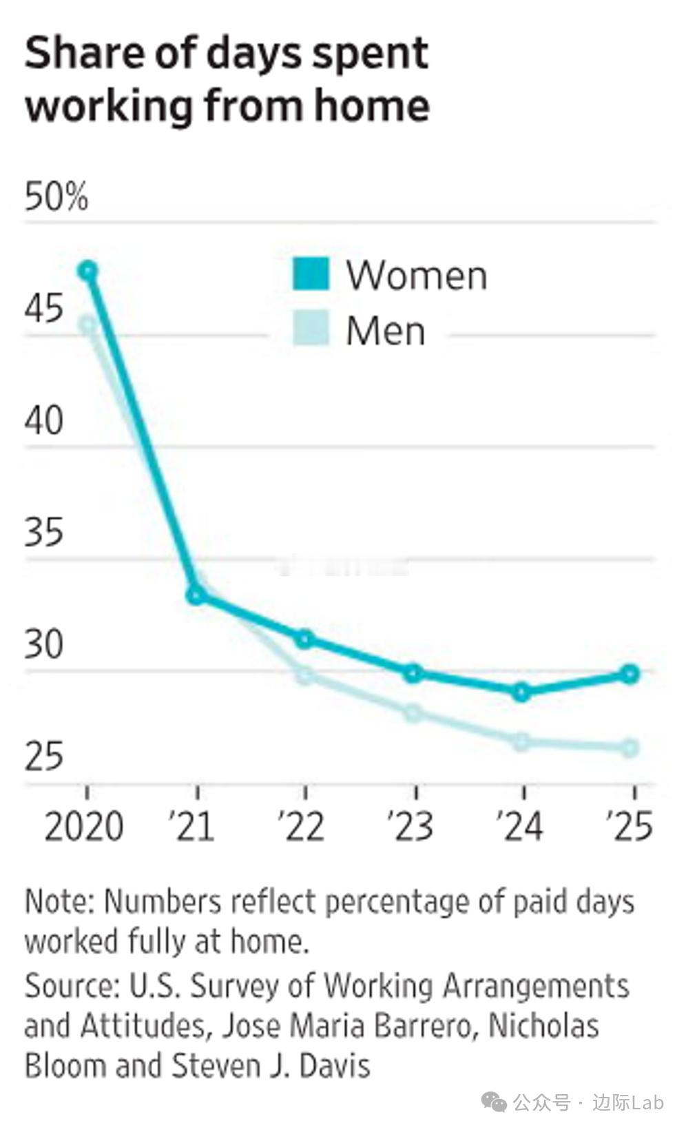 随着美国企业开始要求员工重返办公室,其中的性别差异日益凸显,女性的远程办公的比例持续高于男性,两者差距目前约为3.3个百分点。经济学家认为,这主要反映了女性仍在承担更重的育儿和家务责任,因而更需要远程工作的灵活性。然而,这种模式是一把“双刃剑”:它虽然帮助更多女性得以留在劳动力市场,但远程办公的女性可能在获得反馈、指导及晋升方面面临“邻近偏见”(proximity bias),从而在职业发展上落后于更多选择到岗的男性同事。来源:华尔街日报