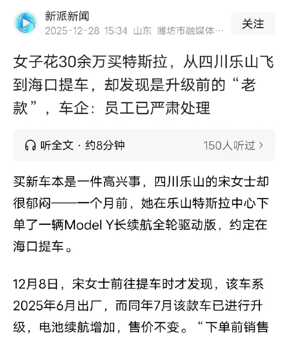 四川乐山,女子花30多万订购特斯拉Model Y长续航后轮驱动版,为尽快提车,她从乐山飞往海口,谁料,提车才发现,车辆是今年6月出厂的老款,续航只有719公里,而7月后升级,续航已经达到750公里。女子不干了,花同样的钱,却买到低续航的,她要求退30万尾款和1000定金并赔偿提车花费的5000元。可4s店却只愿意退还30万尾款,其他的免谈。女子气不过找媒体曝光,可接下来4s店的做法让她难以接受。 今年11月21号,宋女士在四川乐山某4s店下单,订购了一辆特斯拉Model Y长续航后轮驱动版车子。 店员告诉宋女士,预计提车时间是一个多月后,也就是12月底左右。 一开始,宋女士觉得等一个月,她可以接受,后来想想,一个月时间太长了,就让销售员张女士帮忙留意,哪怕是Model Y长续航全轮驱动版,她也可以接受。 几天后,宋女士接到张女士的电话说,系统里原本有一辆全轮驱动版,但由于宋女士没交定金被人定走了。 对此,宋女士很遗憾,也有些着急,原本自己先找的车,却被后来的人抢先了,很郁闷。 11月25号那天,宋女士出门刚好路过那家4s店,她就进去看了一下。 张女士看到宋女士进来热情地招呼她,并在系统里查看了一下,之后她告诉宋女士,又有一辆Model Y长续航全轮驱动版的现车,不过,现车在海南海口。 宋女士一听眼睛就亮了,为了尽快提车,她说她要了,张女士说,如果想要得交1000元定金。 宋女士生怕晚了又被别人抢去,赶紧交了1000元定金。  12月初,在往海口提车前,宋女士给4s店结清了车子的尾款30多万。 几天后,也就是12月8号那天,宋女士飞往海口,打算提车。 没想到,验车的时候她才发现,车子是2025年6月出厂的。 宋女士问海口的店员,这辆车是不是新车? 店员告诉宋女士,她提的这款车是改款前的老款长续航,升级后的车子续航更久一些。 宋女士一听,感觉被耍了,后来她通过了解,她如今要提的车子续航只要719公里,而升级后的车子续航达到750公里。 宋女士知道这些消息,不淡定了,同样的价钱,她买的确实老款的车子,续航还比新款低那么多,论谁都不愿意啊。 宋女士不干了,她拒绝提车,要求乐山的4s店把30多万尾款退给她,另外还要求他们把1000元定金也退了,还要补偿她从乐山飞往海口的车票和各种费用。 可4s店在退了30多万尾款后,却死活不愿意退还那1000元押金,更不会给宋女士任何补偿。 宋女士很气愤,找来媒体曝光此事,4s店回应记者称,销售员张女士已经口头跟宋女士沟通过了,而且还把相关协议书发到宋女士邮箱里。 宋女士说她买了不少车,从没有哪家4s店是把合同发到邮箱里的,如果真的发了,过后他们也会打电话确认。 而且合同书上并没有宋女士的签名确认。 所以,宋女士不认可那份合同,她觉得是张女士故意误导,隐瞒。 记者又联系了4s店长封先生,他说宋女士下单的期货车跟她要提的现车合同是对得上的,至于店员当初是如何口头跟宋女士沟通的,他不清楚。 可记者联系了张女士,她却说,不方便采访和透露。 宋女士告诉记者她在让封先生提供相关依据的时候,她在封先生的聊天页面无意中看到有人指导封先生:咬死我们实际没有误导。 最终,4s店回应记者说,他们查过了,是宋女士自己嫌等期货车太慢,主动换成现车的,线下早就跟销售员商量好了。而合同里的“2025-02”就是个生产批次号,交的车和订单要求的完全对得上。 最终,他们并没有退还1000元定金,也没有任何补偿。 根据《消费者权益保护法》第8条规定,消费者享有知悉其购买、使用的商品或者接受的服务的真实情况的权利。 消费者有权根据商品或者服务的不同情况,要求经营者提供商品的价格、产地、生产者、用途、性能、规格、等级、主要成份、生产日期、有效期限、检验合格证明、使用方法说明书、售后服务,或者服务的内容、规格、费用等有关情况。 宋女士购买特斯拉Model Y时,销售人员没有主动告知宋女士拟提的现车是2025年6月出厂的改款前老款,也没有说明7月后同款车型已升级续航。 张女士没有完整披露商品的性能、生产批次及版本差异等关键信息,直接导致宋女士基于信息不对称做出购车决策,特斯拉4S店的行为侵犯了宋女士的知情权,违反了该条款规定。 《民法典》第148条规定,一方以欺诈手段,使对方在违背真实意思的情况下实施的民事法律行为,受欺诈方有权请求人民法院或者仲裁机构予以撤销。 张女士没有告知车型版本差异,且合同由销售代录后仅发至邮箱未让宋女士签字确认,如果有证据证明销售人员存在故意隐瞒老款车型事实、误导宋女士认为所购为新款车型的行为,就构成欺诈。 宋女士可以请求撤销相关购车约定,并要求4S店返还定金及赔偿损失。 对此,大家怎么看?