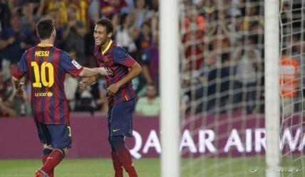 【西甲-梅西内马尔传射 巴萨4-1皇家社会开季6连胜】2013/14赛季西班牙足球甲级联赛第6轮一场焦点战在诺坎普球场展开争夺,巴塞罗那主场4比1大胜皇家社会。内马尔打入处子球后又助攻梅西头球破门,布斯克茨扩大比分,德拉贝拉扳回一城,巴特拉进球锦上添花。西甲