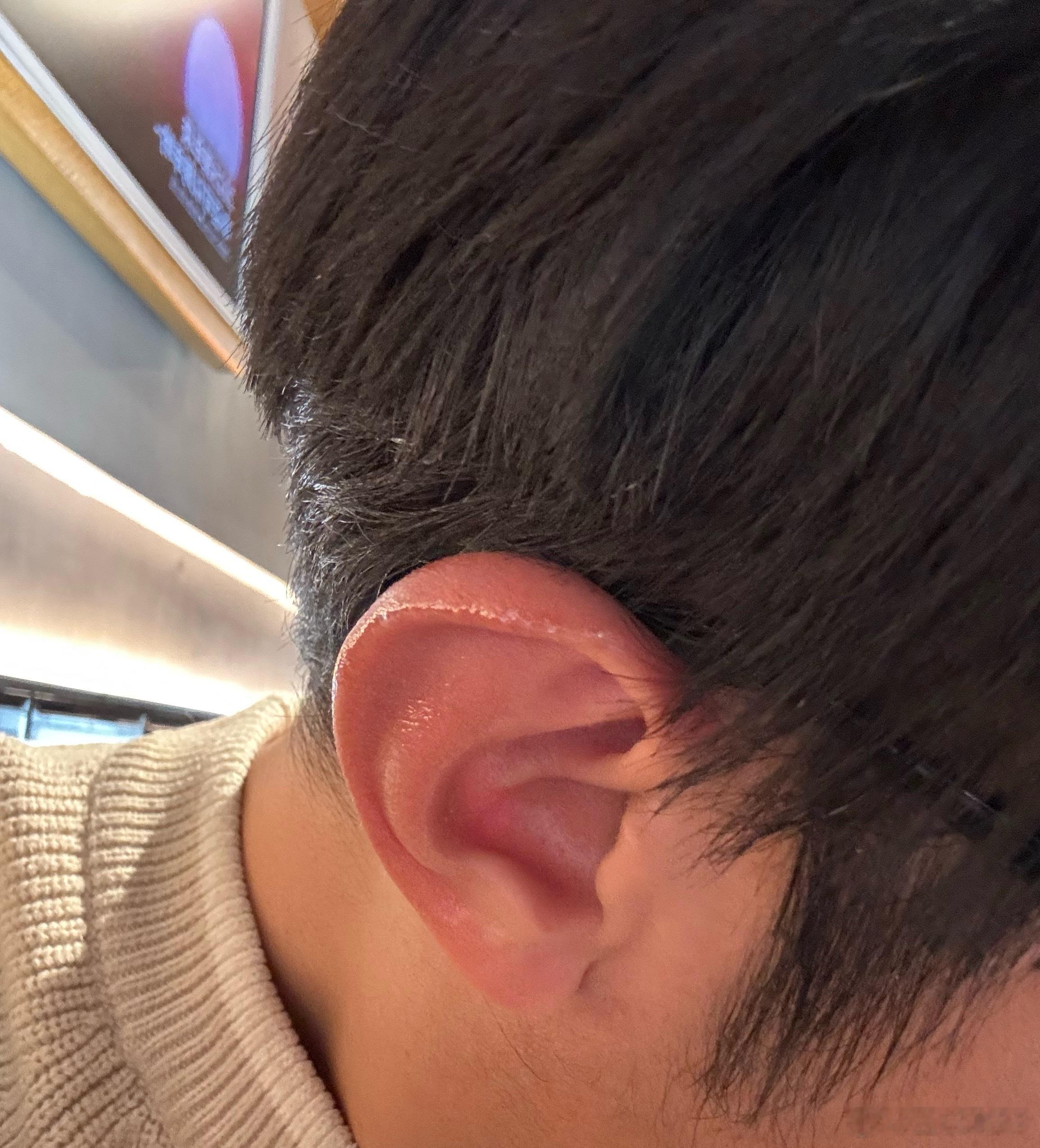 在零下30度的室外待了10分钟,突然感觉耳朵巨疼,然后赶紧回室内,过了会耳朵就发烫,后来朋友和我说,是冻伤了。现在就是这么个状态,红彤彤,抹了点膏,油唧唧…