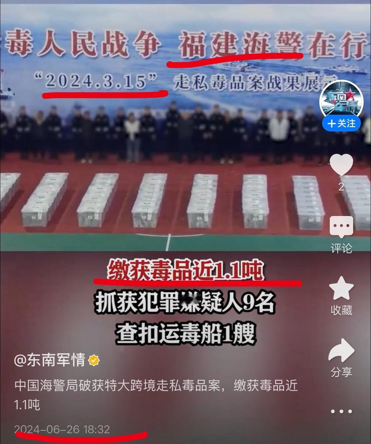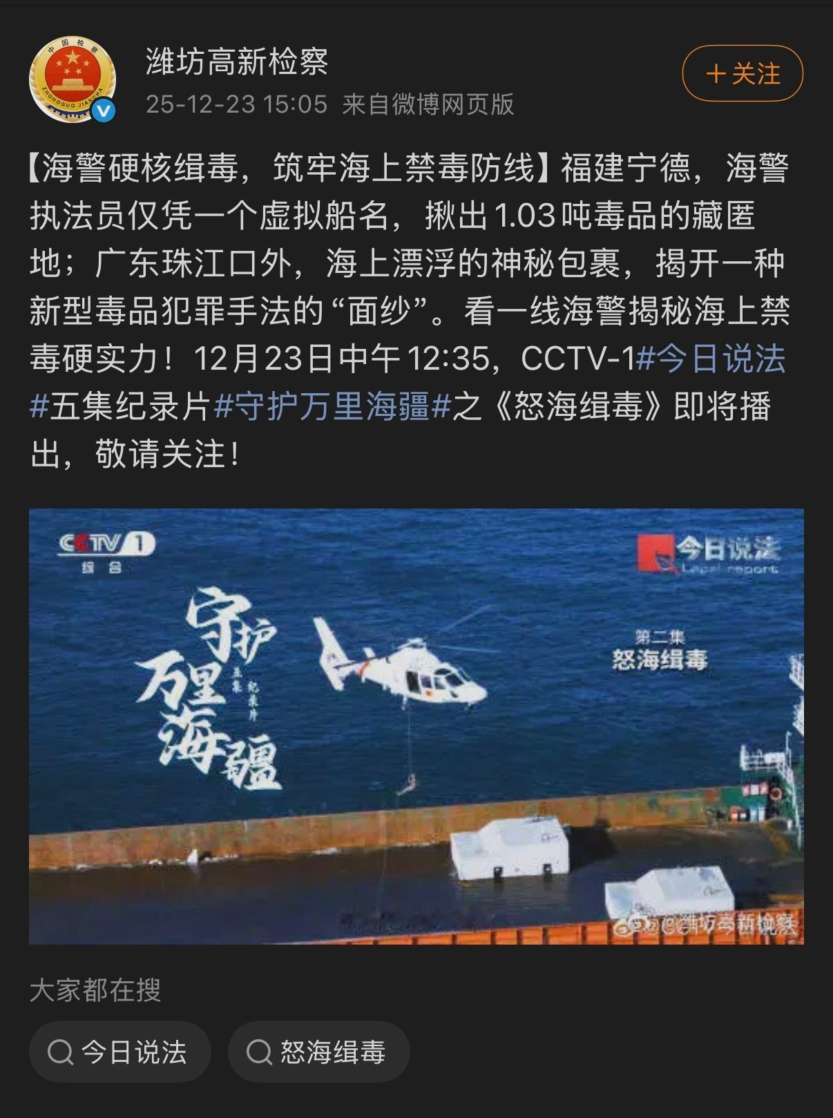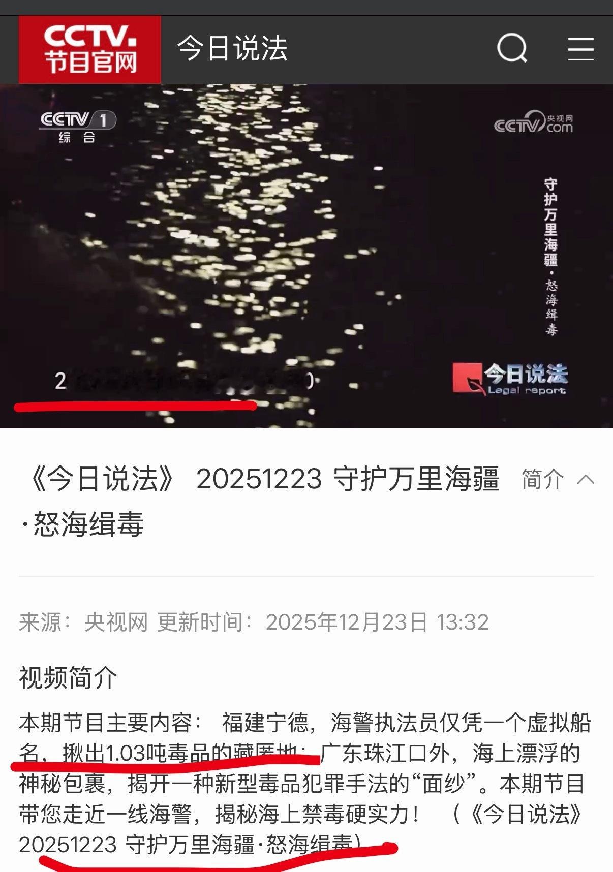 🔻看到首页好多人像图1这样刷屏表达自己的担心,担心最近是不是嗅到腥味蠢蠢欲动的境外“毒蛇”多起来了。🔻这里有个误会:宁德1.03吨这个案子,是中国海警去年破获的“2024.03.15案”,只是最近在今日说法五集纪录片里播出(图2-图5)。🔻所以,这个案件并不是在那件热议话题之后发生的。🔻今年2月中国海警还在黄岩岛西南海域破获了一起4.973吨的案件,也是发生在之前,目前暂时还没看到有数据说明相关案件频次、规模在最近出现巨大变化。🔻这点应该说明。