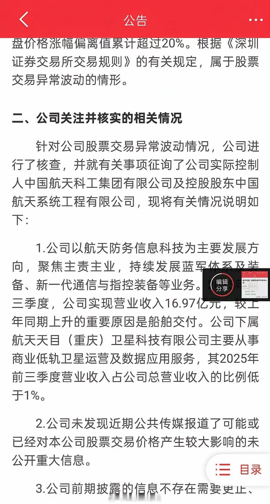 注意!注意!大风险滚滚而来!周末利好很多,机器人,商业航天,贵金属,能源金属!都觉得周一行情会不错了。刚刚,我看到航天发展发布异动公告! 核心内容就是讲:下属公司“航天天目”(做商业低轨卫星运营的)在2025年前三季度的营收,占公司总营收的比例低于1%。说白了就是: 目前的股价暴涨和公司的实际卫星业务收入完全不匹配,纯属概念炒作。你们品品。品品!周五航天发展高位加速涨停,周末商业航天利好,现在晚上出了个异动公告。周一感觉不大好了!周五商业航天情绪太一致了!现在风险来了,周一要小心哦!控制好仓位,小心高低切!可以考虑考虑证券,互金,消费!