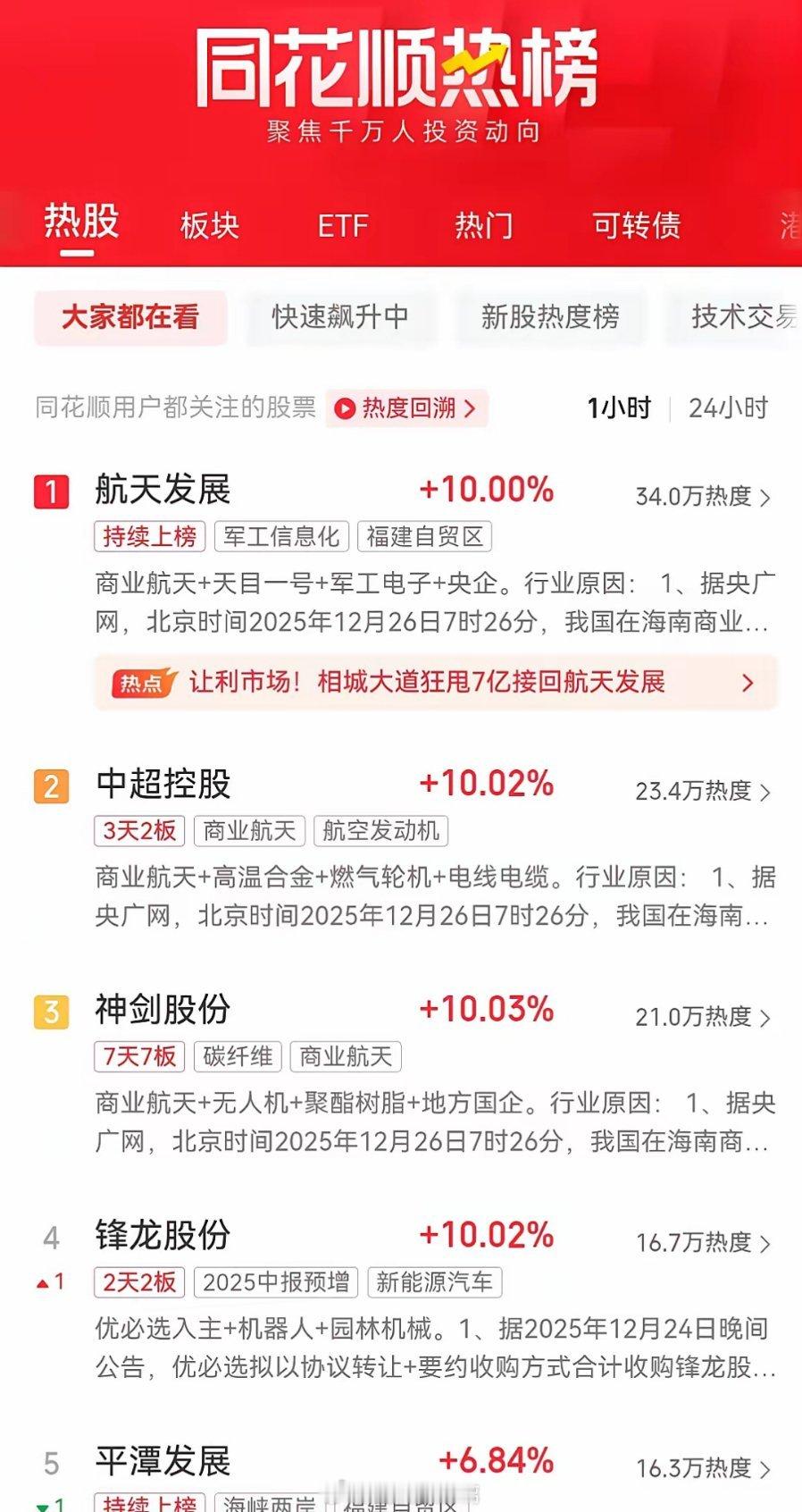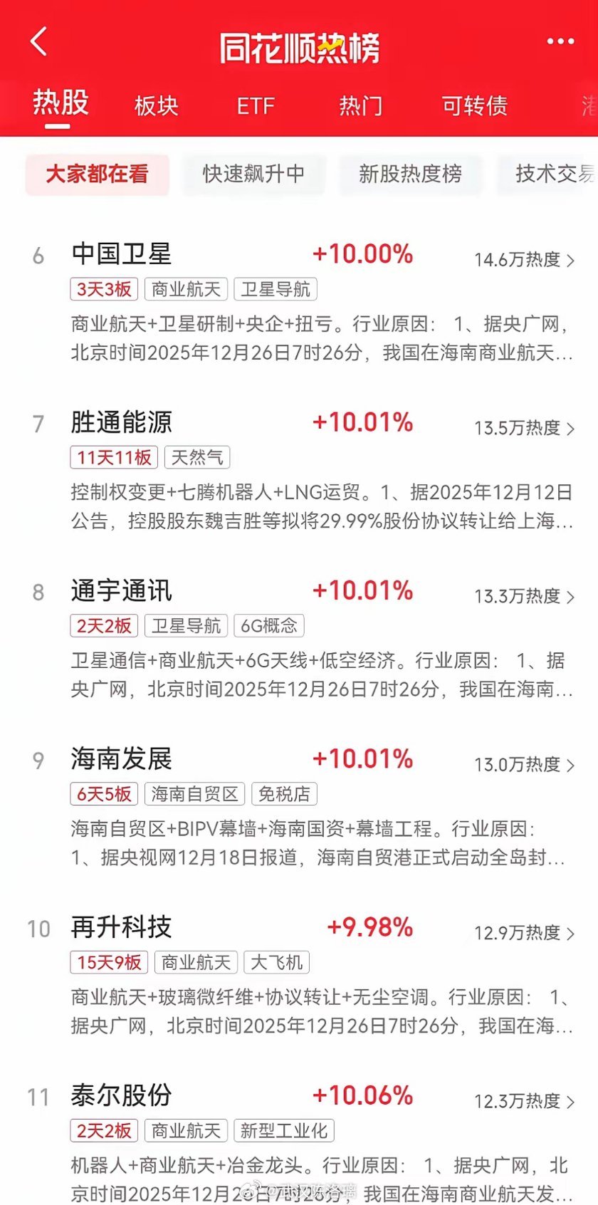 明天股市开盘在即!上周热门题材股不断发酵,一起看看目前热门股前十名有哪些:1. 航天发展题材:军工信息化、福建自贸区、商业航天、天目一号、军工电子、央企2. 中超控股题材:商业航天、航空发动机、高温合金、燃气轮机、电线电缆3. 神剑股份题材:碳纤维、商业航天、无人机、聚酯树脂、地方国企4. 锋龙股份题材:2025中报预增、新能源汽车、优必选入主、机器人、园林机械5. 平潭发展题材:海峡两岸、福建自贸区6. 中国卫星题材:商业航天、卫星导航、卫星研制、央企、扭亏7. 胜通能源题材:天然气、控制权变更、七腾机器人、LNG运贸8. 通宇通讯题材:卫星导航、6G概念、卫星通信、商业航天、6G天线、低空经济9. 海南发展题材:海南自贸区、免税店、BIPV幕墙、海南国资、幕墙工程10. 再升科技题材:商业航天、大飞机、玻璃微纤维、协议转让总的来说还是商业航空热度高啊,不过要提醒大家的是,上周涨幅较大,注意不要盲目追高了!个人观点,仅供参考,不构成投资建议!