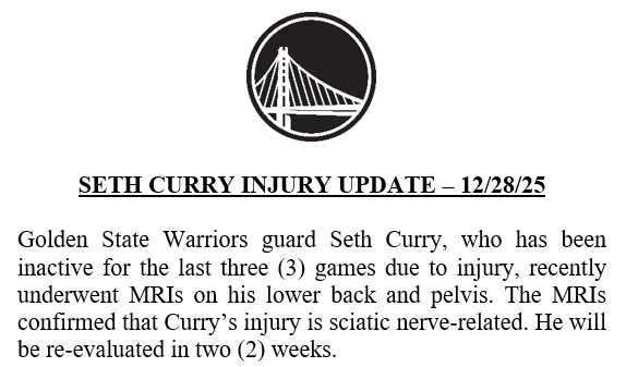 勇士队官方宣布,塞斯·库里接受了核磁共振检查,结果显示其伤势与坐骨神经问题相关。他将在两周后接受重新评估。金州勇士