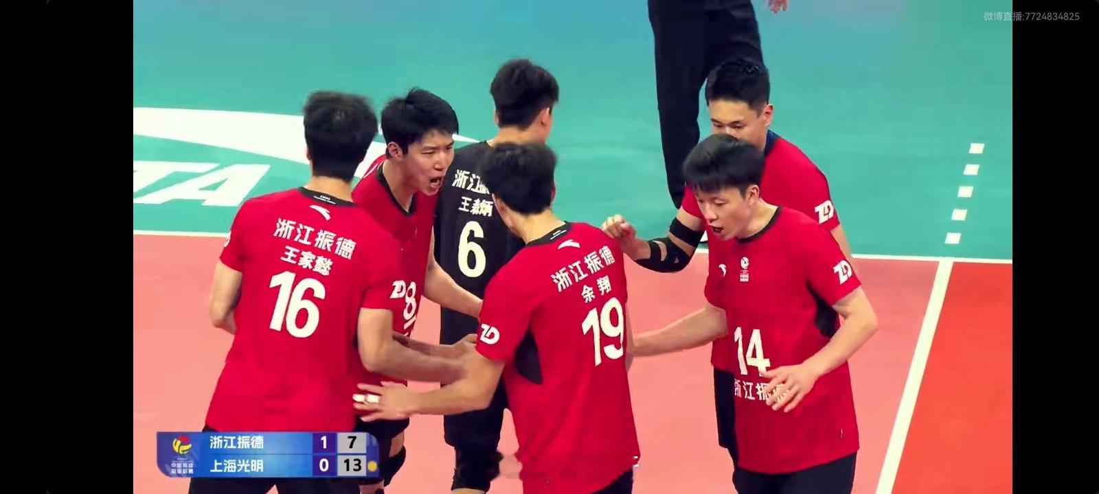 男排联赛的焦点战,浙江3比2上海,五局比分为25-20, 18-25, 26-24, 25-27, 15-11,其中第五局也是非常戏剧性,浙江队7比11落后,然后连得8分,直接逆转到比赛结束!排球排超联赛中国男排中国男排