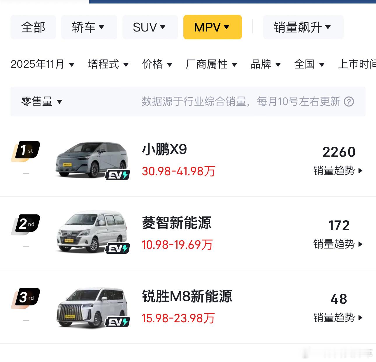 看了下增程MPV这个品类,从车型数量来看相当的小众,目前能查到的车型只有这几款,除了目前小鹏X9明年上半年估计还有银河V900、智界V9、零跑D99这几款陆续上市。新能源汽车