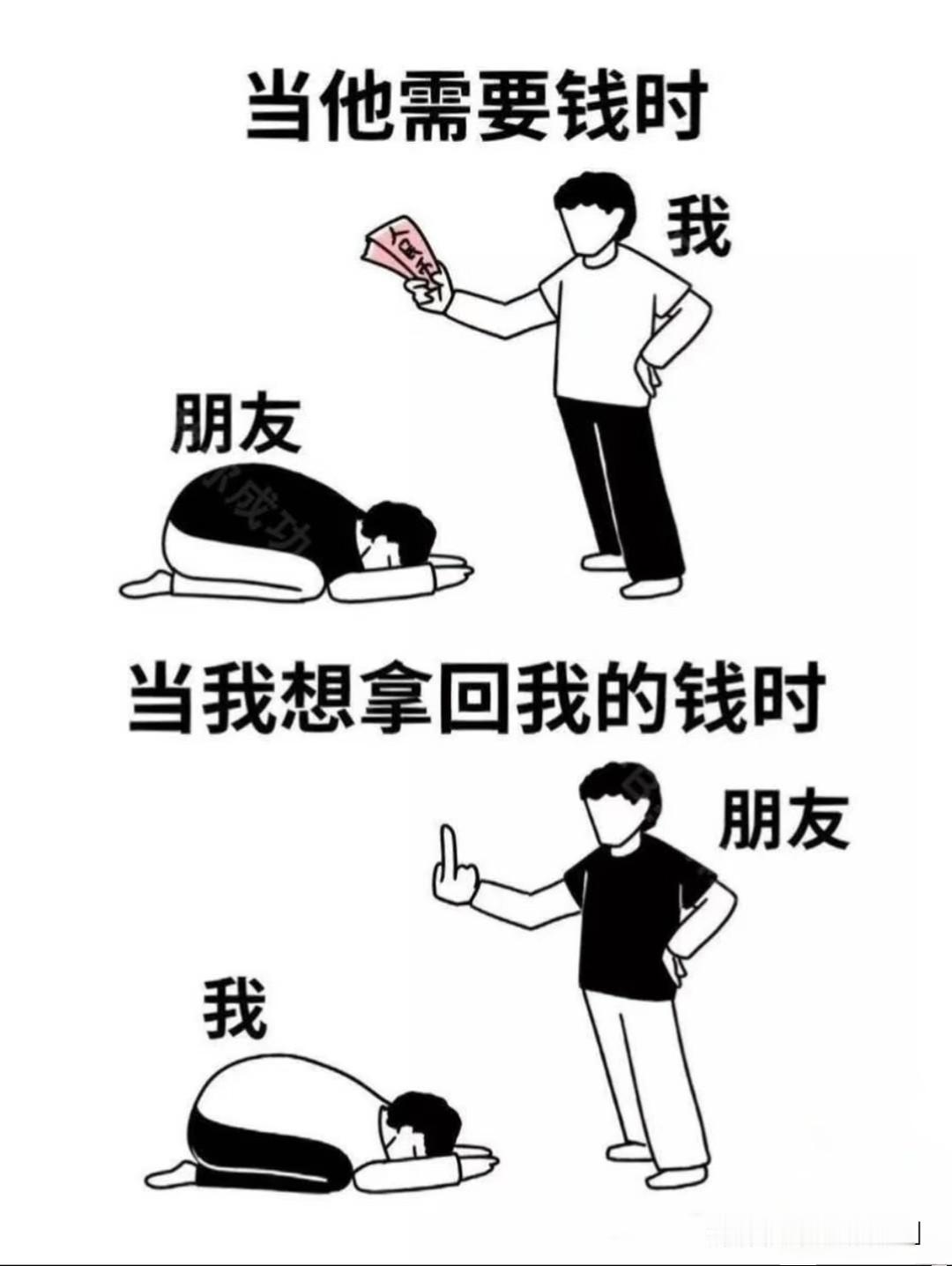 借钱不还的人,都是怎样的想法呢? 经济困难,借款后遭遇失业、疾病、生意失败等变故,确实无力偿还,但可能因羞愧或逃避心理不愿主动沟通,希望等有钱再还,但拖延中债务越积越多,最终选择回避。将借钱视为占便宜,认为凭本事借的钱为什么要还,缺乏基本的契约精神。觉得债权人不会追究,如朋友碍于情面、小额债务维权成本高,故意拖延或消失。 认为关系好就不该催债,甚至反怪对方小气,用情感压力淡化自己的义务。通过借钱测试他人容忍度,若对方不催,便得寸进尺。 将个人利益置于首位,忽视诚信和他人损失。若周围环境对失信行为容忍度,如某些圈子认为赖账是本事,可能形成习惯性赖账。编造理由说服自己不还钱是对的,如对方曾经亏欠我,他比我富裕,减轻内心冲突。害怕面对冲突或羞愧,用失联、撒谎等方式逃避问题。 借钱时就没有打算还,可能用于挥霍、赌博等非必要支出,属于道德甚至法律层面的欺诈。 如何应对借钱不还的人, 冷静表达诉求,设定具体还款期限,保留书面记录,借条、聊天记录等。小额借款可视为情感代价,重新评估对方可信度,大额债务需严肃对待。 书面约定,明确金额、期限、利息,合法范围内,减少后续纠纷,借出时做好可能不还的心理准备,避免影响自身生计。面对借钱不还的人,保持理性而非过度情绪化是关键。他们的行为更多反映了自身的价值观和处境,而非你的价值。当金钱与人性相遇时,信任是一面镜子,照出的是人心深处的品格,而非单纯的数字。