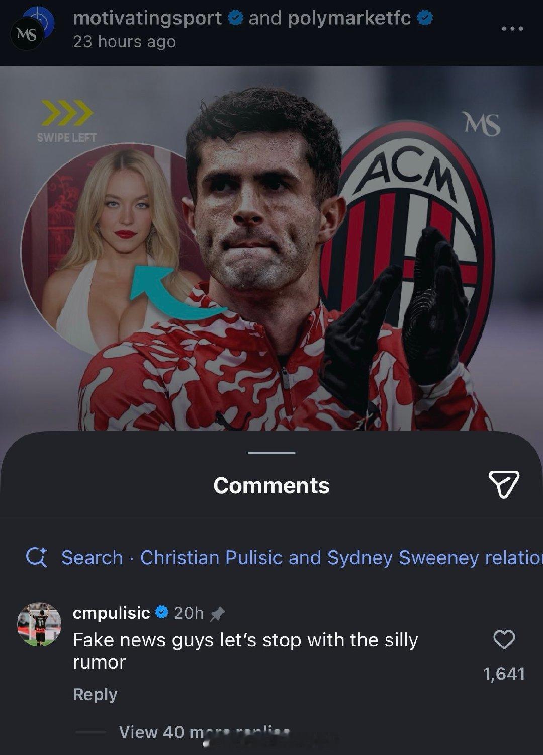 【普利西奇否认与悉尼妹恋情】最近几天,一些国外博主在爆料,AC米兰中场,27岁美国国脚普利西奇,正与好莱坞女演员斯威尼谈恋爱。来到周日,普利西奇在个人社交主页,正式否认相关的传闻:“请停止编造关于我个人生活的故事,有必要追究之些消息来源的责任,这可能会影响人们的生活。”"普利西奇还对另一篇报道谣言的社交媒体帖子发表了评论,写道:“假新闻,伙计们,让我们停止愚蠢的谣言吧。”。