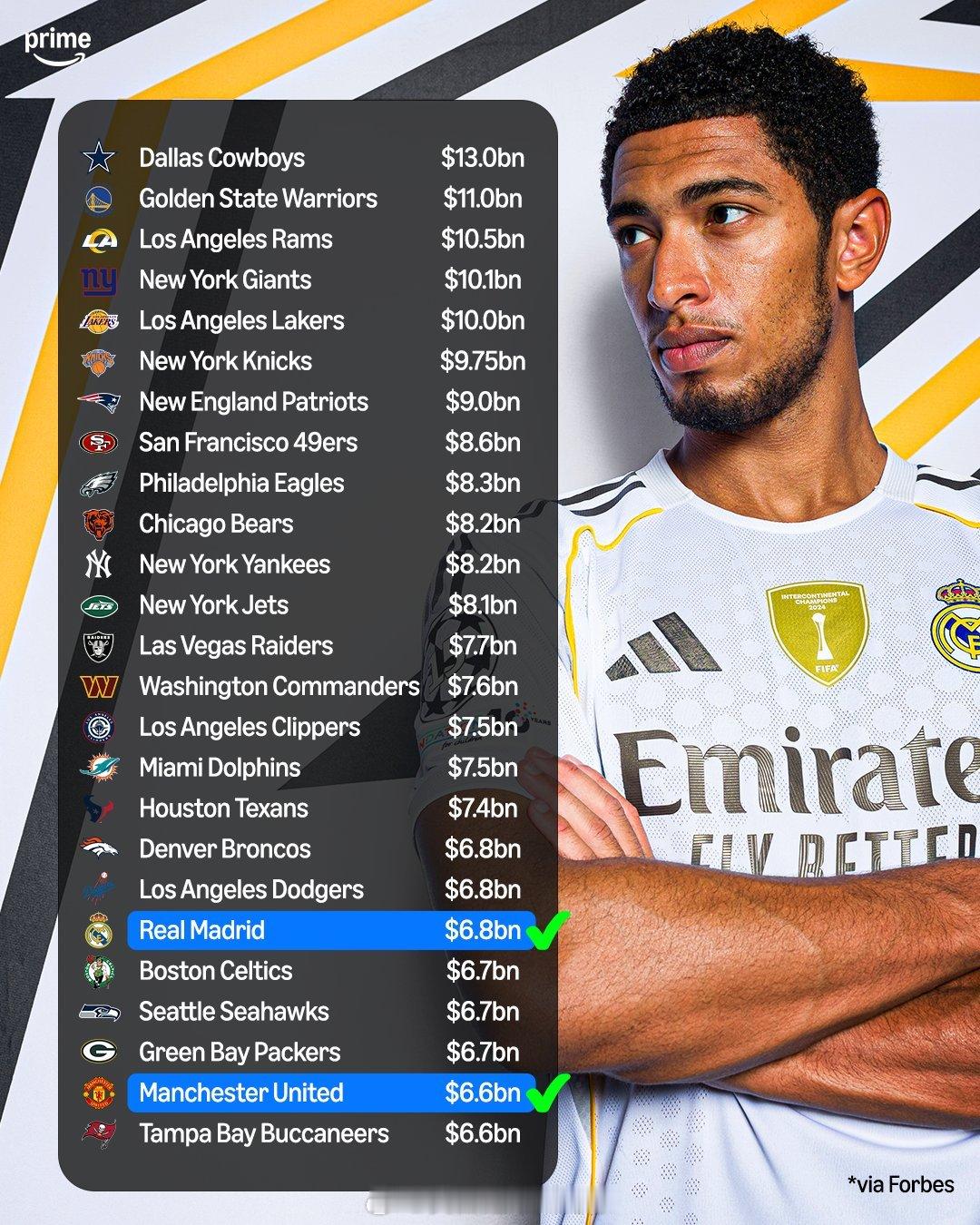 【足坛最有市场价值的球队】《福布斯》杂志公布,2025年最有市场价值体育队伍TOP25榜单,只有两支足坛豪门上榜,皇马与曼联,其他23支球队,基本上是北美四大运动联赛的球队。