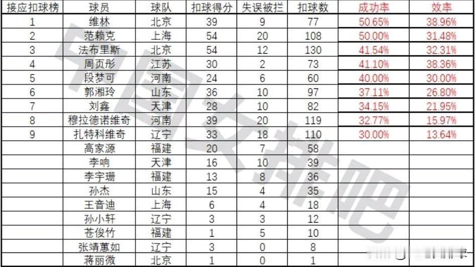 接应,中国女排比较绝望的位置! 有球迷统计排超前4轮接应的数据,不看不知道,一看吓一跳。 排名前3的全是外援! 而本土球员排在前三的是周页彤、段梦可、郭湘玲。 周页彤成功率41.10%,效率38.36%! 具体数据请看图2! 周页彤不怎么接一传,2号位置属于偷几个球的,江苏女排有时候打着打着,成了吴梦洁的一点攻。 段梦可,不接一传。表现最为出色的第5轮,可是对手却是弱队辽宁女排。这样的比赛数据不能完全作为参考!她的防守和小球串联一般,比较擅长的定点攻。 郭湘玲,山东女排的比赛看得不多。发球不错,至于进攻没有那么惊艳。偏保障型接应! 想看看她在后面2轮对阵江苏和上海的表现如何? 中国女排接应老大难,可以想象以后对手直接放过二号位,重点盯防我们的4号位就行了! 现在既缺接应,还缺2号背飞强的大副! 似乎中国女排的短板越来越多!