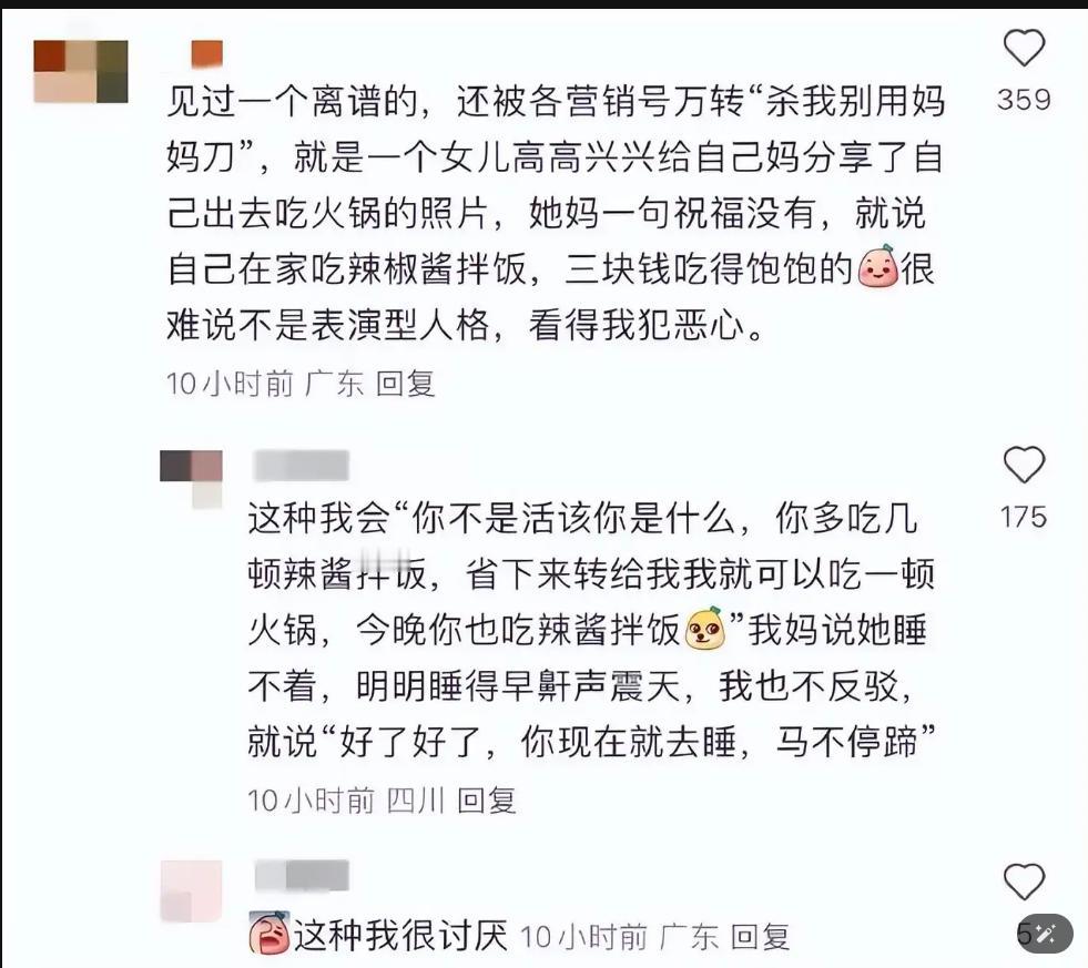 我吃20块盒饭,我妈骂我奢侈”:中国式父母的最大悲哀,是见不得孩子快乐 昨天刷到一个热搜帖子,真的破防了。 一个女生开心地给妈妈发午餐照:番茄炒蛋+鱼香肉丝,普通盒饭而已。 妈妈连发两条语音:“我老孩天天吃好的!天天吃好的!剩菜带回来,妈晚上热热吃。” 女生瞬间下头:“这点菜还要留第二顿?要不我直接去垃圾桶捡?” 更扎心的是—— 有妈妈因为女儿吃草莓和虾失眠,认为“好东西必须过年吃”; 有爸爸在女儿滑雪照下评论:“我这辈子想都不敢想”; 甚至有人问:“给孩子手术不打麻药,让他吃点苦行不行?” 多少父母,总把孩子当“罪人”养? 你分享快乐,他骂你浪费; 你享受生活,他说你忘本。 慢慢的孩子不敢开心—— “我笑了,就是对不起爸妈的苦。” 可真相呢? 那份“奢侈大餐”,只是一份外卖; 那句“我吃你剩的”,更像一场自我感动式的苦情戏。 🌟总用愧疚绑架孩子的父母,最终只会养出“不配幸福”的成年人。 苦难从不该被歌颂,爱更不应该是债。 你遇到过这样的“扫兴父母”吗? 评论区说出你的故事,我们一起抱一抱。