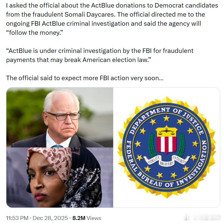 本尼·约翰逊:我刚刚与一名FBI高级消息人士交谈,他告诉我,联邦调查局已加派刑事调查小组前往明尼阿波利斯,并预计很快将对索马里欺诈分子进行“公开抓捕”。这位官员表示,他们密切关注尼克·施利的调查,并称其“与 FBI 在当地的刑事工作一致”。“通过欺诈性企业盗取的联邦资金达数十亿美元。这些都是严重的联邦犯罪,可能导致高额罚款、数十年监禁以及潜在驱逐出境。”该官员以近期针对索马里欺诈分子因盗取COVID资金而提出的78项刑事起诉为例,说明即将发生的行动。我问及这些欺诈性索马里日托机构向民左党候选人通过ActBlue捐款的情况。官员指出,FBI正在进行ActBlue的刑事调查,并表示机构将“追查资金流向”。“ActBlue正在接受FBI的刑事调查,因涉嫌欺诈性付款可能违反美国选举法。”官员表示,预计FBI很快会有更多行动。