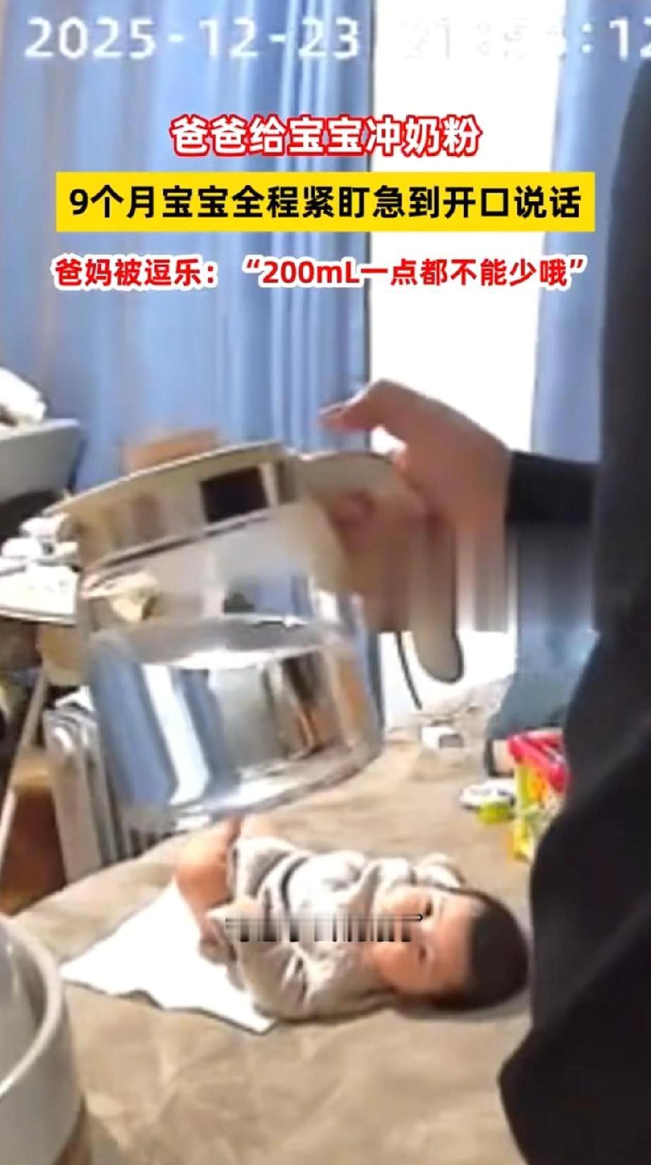 人类幼崽有多精?9个月宝宝急喝奶,直接报出200毫升奶粉量。 北京一位宝爸给娃冲奶粉,9个月大的宝宝全程小眼睛瞪得溜圆,死死盯着爸爸的动作,生怕慢了一秒,结果等得着急的宝宝,突然冒出一句“200”,把宝爸宝妈直接逗得笑出眼泪。 原来爸妈平时冲奶粉总念叨着冲200毫升,小家伙记在了心里,急着喝奶就脱口而出,这波人类幼崽的超前语言天赋,萌翻网友!大家都调侃:“这娃是饿急了,连剂量都报上了,主打一个精准催单!” 你家娃有没有过什么语出惊人的可爱瞬间?评论区晒一晒~ 人类幼崽 人类幼崽可以多可爱[话题]