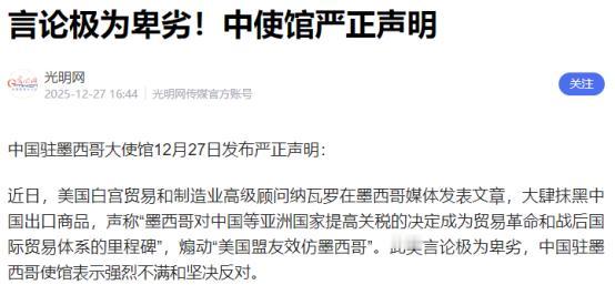 既然给脸不要脸,那就准备接招!北京驻墨使馆的怒斥,只是第一声发令枪。中国这次不仅要骂,更要打,而且要往死里打!墨西哥想纳“投名状”讨好美国?行,那我们就成全你,直接切断你制造业的“大动脉”。不把你揍得满地找牙,别的国家还以为中国是只没牙的老虎!   2025年12月,墨西哥国会以357张赞成票压倒性通过对华加税法案,针对1371种中国商品加征最高50%的关税,覆盖汽车、纺织、钢铁、玩具等关键行业,明年1月1日就正式生效。   辛鲍姆政府嘴上喊着要减少进口依赖、扶持本土制造业,还吹嘘这能每年给财政新增37.6亿美元收入,可明眼人都知道,这背后全是美国在施压。   毕竟2026年《美墨加协定》要首次全面审查,特朗普早就放话要严查中国商品通过墨西哥转口进入美国市场,而墨西哥对美贸易依存度高达80%,哪里敢得罪这位大哥?为了保住对美顺差,它只能拿中国当投名状,硬生生把曾经的双赢伙伴,变成了讨好美国的祭品。   可墨西哥的算盘打得再响,也没算清自己的命门有多脆弱。它的制造业早就深度绑定中国,加税根本就是在给自己捅刀子。中国是墨西哥第二大贸易伙伴,2024年两国贸易额已经突破1094亿美元,更关键的是,墨西哥制造业的饭碗全靠中国供应链撑着。   汽车行业是墨西哥的支柱产业,可超过80%的零部件都得从中国进口,小到螺丝钉,大到变速箱总成,少了中国供货,生产线就得直接停摆。家电行业更夸张,60%的小家电直接从中国采购,70%的工厂设备都是中国制造。   就连近几年墨西哥大力发展的光伏产业,35%的组件来自中国,半导体封装线四成设备都是深圳、无锡产的,这些核心供应链,根本不是短期能替代的。   美国智库早就模拟过,墨西哥加税后,美国进口商品成本只涨3.5%,但墨西哥本土制造成本会飙升15%到25%。   现在墨西哥核心通胀率已经4.32%,超过了3%的预定目标,加税之后,原材料、零部件价格肯定暴涨,这些成本最后还得转嫁到消费者身上,通胀只会更严重。   墨西哥汽车协会早就警告过,加税会让汽车出口竞争力暴跌,北美市场份额肯定保不住,工厂要么涨价要么裁员,本土工人先得面临失业危机。   更讽刺的是,墨西哥想讨好美国,结果反而推高了美国车企的成本,最后落得个里外不是人。之前2024年墨西哥就试过对铝及铝合金加税,结果才10天,就因为国内生产不足、电子行业缺料,只能仓促取消,这次非要硬扛,纯属自寻死路。   中国从来不是任人拿捏的软柿子,北京驻墨使馆的怒斥只是开始,我们早就留好了后手,真要动手,就能精准打在墨西哥的七寸上。   早在2025年9月,墨西哥刚放出加税风声,中国商务部就启动了贸易投资壁垒调查,覆盖汽车及零部件、纺织品、钢铁等所有受影响行业,还明确表态会采取一切必要措施维护企业权益。   这可不是吓唬人,墨西哥本来就依赖中国的供应链,我们只要稍微收紧,它的制造业就会陷入瘫痪。比如汽车零部件断供,墨西哥的汽车工厂不出一个月就得停工;光伏组件受限,它的新能源项目就得烂在手里。   更别说中国还能对等反制,墨西哥对华出口的龙舌兰、牛油果、铁矿这些,都是中国市场能放能收的阀门,真要加征关税,墨西哥数十亿美元的出口收入瞬间就会蒸发。   墨西哥以为牺牲中墨合作就能换来美国的青睐,却忘了美国从来只把它当工具,用完就扔。   美国逼墨西哥反华,本质上是想封堵中国商品进入北美的通道,把墨西哥变成对华供应链的防火墙,可一旦墨西哥失去了制造业竞争力,美国企业只会加速把产能转移到东南亚或本土,到时候墨西哥连当工具的价值都没有。   更别提墨西哥此举已经彻底破坏了自己的营商环境,近几年中企在墨西哥投了几百亿美元,建了电动汽车产业园、光伏发电站等项目,现在政策突然转向,国际资本都会对墨西哥望而却步,长期发展潜力直接被透支。   看看越南就知道,同样夹在中美之间,却靠着平衡外交吸引了大量中企投资,2024年FDI增长18.2%,而墨西哥非要一条道走到黑,最后只会从贸易枢纽变成孤立的孤岛。   现在中国已经在调整布局,中企的投资早就开始转向巴西、智利等拉美国家,还有东南亚和非洲市场,墨西哥失去的订单,有的是国家抢着要。   而墨西哥这边,加税带来的短期财政收入,根本弥补不了长期的经济损失,它的财政赤字占GDP比重已经高达5.7%,加税只会让经济更疲软,通胀更严重,最后民众怨声载道,政权稳定都成问题。   谁要是敢拿中国的利益去讨好美国,谁要是敢当美国的看门狗来咬中国,就得付出惨痛代价。别以为中国好说话,真把我们逼急了,直接切断你的制造业大动脉,让你满地找牙,到时候再想求饶,可就晚了!