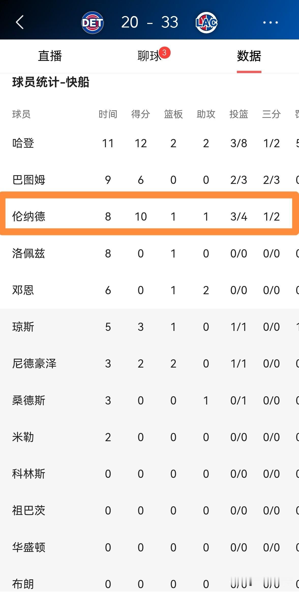 我必须要大肆称赞一下快船巨星伦纳德!在今天快船主场迎战活塞的比赛中,目前双方的第一节比赛已经结束,快船以33:20领先对手。在首节比赛中,伦纳德首发出战8分钟,投篮4中3,其中三分球2中1、罚球3中3极其高效的砍下10分,还有1篮板1助攻2盖帽,没有出现失误和犯规,他的场上正负值为+14。 毫不夸张的说,放眼当今联盟,能够像伦纳德这样进攻高效且防守能力出色的巨星真是凤毛麟角。