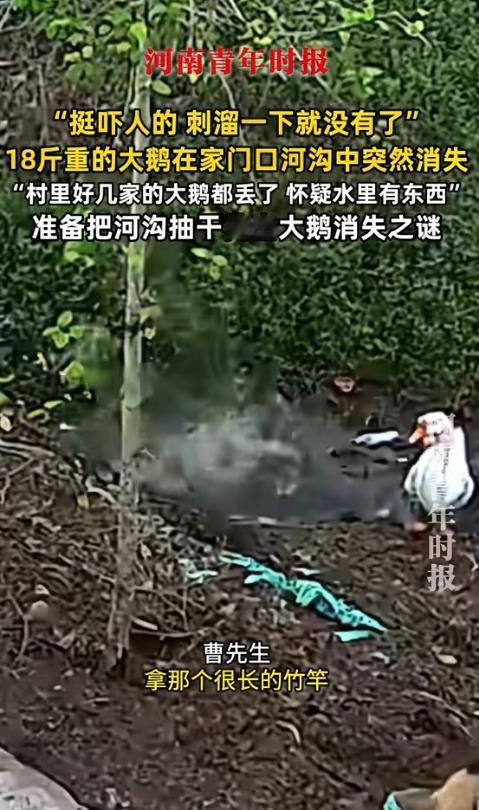 这下科学也解释不清了!近日河南信阳,男子从外地回家过冬至,在跟家里聊天时,家人说起上个月有大鹅在河沟里突然消失从此找不到了,男子瞬间懵了,打开监控一看,更是被吓了一身冷汗,这水里面可能有东西。   冬至前后,河南信阳有个大哥从外地打工回家过节,跟家里人聊天的时候,突然听到一个让人发懵的消息——上个月家里养的18斤大鹅,在门口河沟边上活动,居然凭空消失了!   大哥一听就不对劲,18斤的大鹅可不是小体型,就算跑丢了也该有个踪迹,怎么会说没就没?   他赶紧去调了家门口对着河沟的监控,这一看直接惊出一身冷汗!   监控里清清楚楚显示,大鹅正在河沟浅水里溜达,毫无征兆地就被水下一股劲儿拽了一下,“唰”地一声就没影了,水面就泛了圈小涟漪,很快就平了。   大哥越想越不安,转头问了同村的人,结果更吓人——村里好几户人家的大鹅,都是在这条河沟附近丢的,时间还都差不多。   这一下,全村人都笃定了,河沟底下肯定藏着东西!   商量来商量去,大家决定干脆把河沟的水抽干,不管底下是啥,都得查个明白,不然不光家禽不安全,万一哪天小孩去河边玩,出点事可就晚了。   有懂行的网友说,冬天水里的大型肉食鱼比如黑鱼、鲶鱼,为了过冬要攒能量,攻击性特别强,拖走18斤的大鹅完全有可能。   也有人猜是不是河沟里水草太密,大鹅不小心缠进去溺水了,但这说法根本站不住脚——好几户人家的鹅都在这丢了,总不能都刚好缠水草里吧?   咱们都知道,农村的河沟、水塘大多是自然形成的,常年没人清理,也没人排查安全隐患,水有多深、底下有啥,全靠村民自己摸索。   这次大鹅失踪能引发这么多关注,核心就是大家都怕“未知的危险”:河沟边上不光是家禽去,小孩放学可能会去玩水,大人也可能去洗衣、洗菜,要是底下真有攻击性的东西,后果不堪设想。   说句实在的,村民决定抽干河沟,看着是“找鹅”,本质上是对自己和家人安全的负责,也给所有农村地区提了个醒:这些看似不起眼的野外水域,其实都是安全盲区。   冬天天寒地冻,野生动物为了找吃的,活动范围会变大,难免靠近村子;再加上不少乡村水域长期没人管,水生生物想怎么长就怎么长,自然容易出现“拖走大鹅”这种吓人的事。   现在河沟还在抽水,到底是啥把大鹅拖走了,还得等后续消息,不过不管最后真相是啥,这事儿都给咱们敲了个警钟:乡村安全真没小事。   你们觉得水下大概率是啥东西,要是你在村里遇到这种事,会支持抽干河沟排查吗? 信息来源:黄河微视