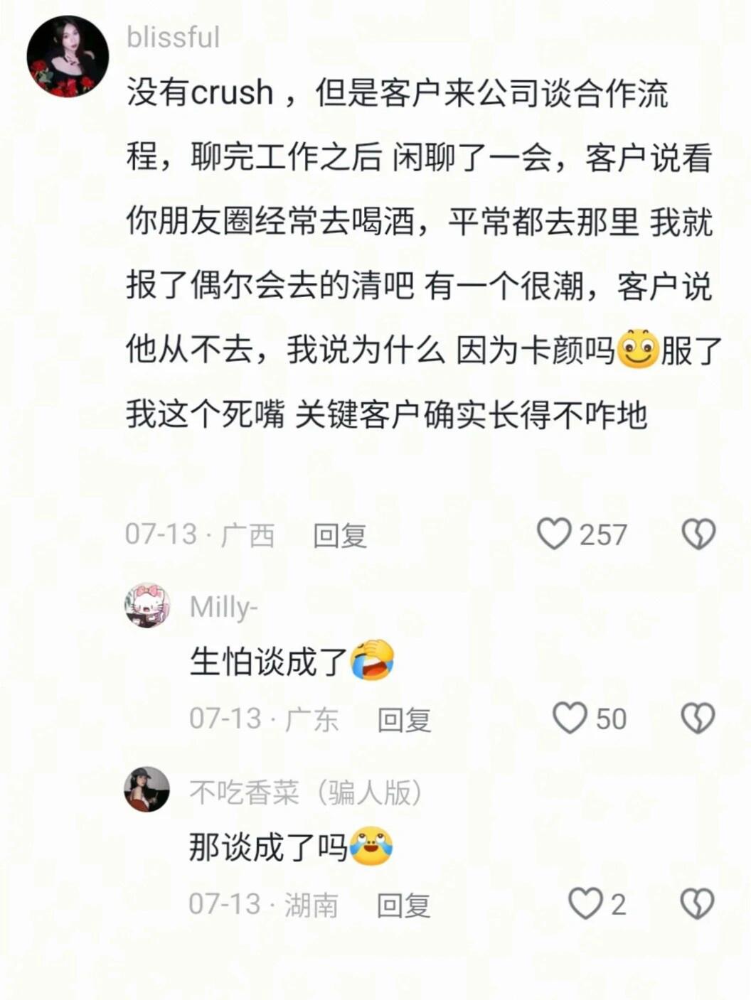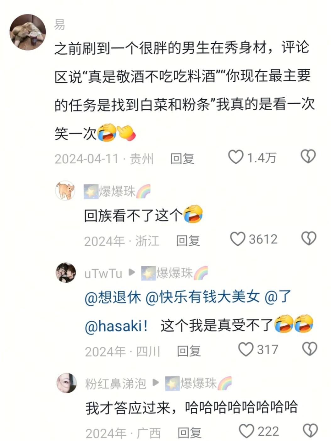 之前刷到一个很胖的男生在秀身材,评论区说"真是敬酒不吃吃料酒""你现在最主要的任务是找到白菜和粉条"我真的是看一次笑一次