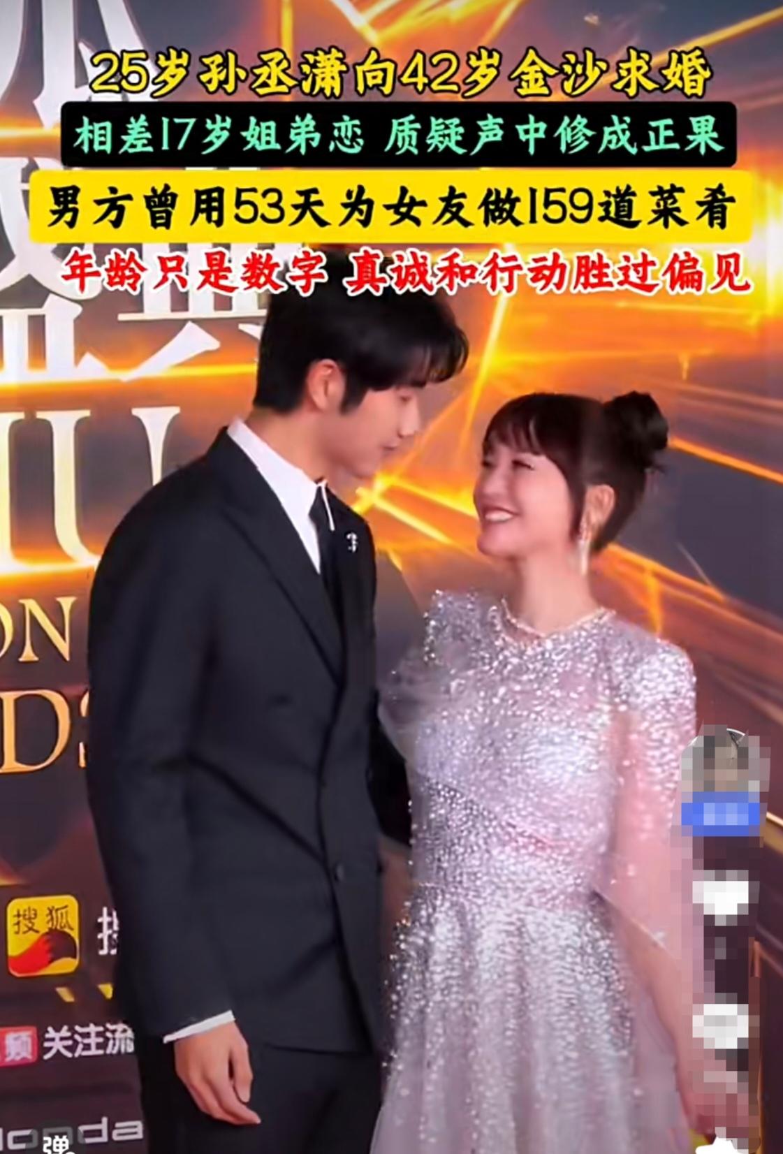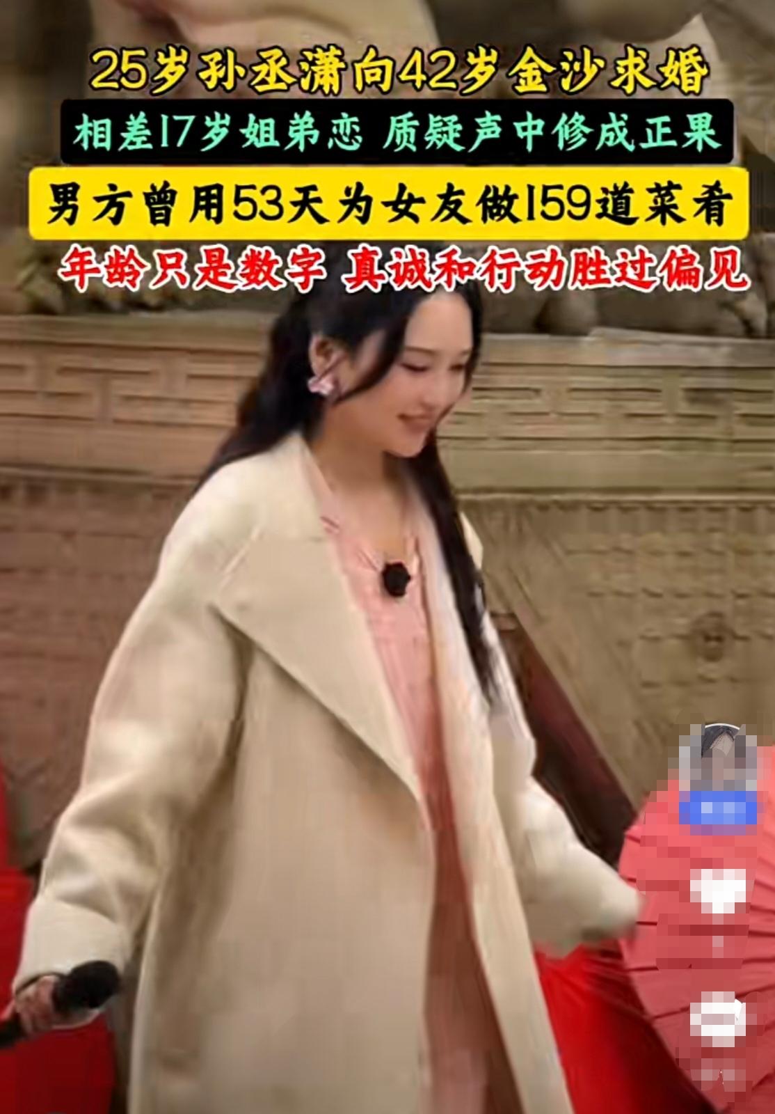 金莎让我又相信了爱情。 孙丞潇向大19岁的女友金莎求婚成功,姐弟恋已上岸。 金莎曾经说过:好男人是不会在市场上流通的,遇到了就要主动出击,抢过来[呲牙]。 看我信不信,我信了。[赞]。 孙丞潇曾经说过:不以结婚为目的的谈恋爱,那是耍流氓。我也信了[呲牙]。 孙丞潇以53天159道不同的菜收获金莎的芳心,让金莎看到这个追她小她19岁男孩的诚心与爱情。 金莎与孙丞潇的一纸婚前财产协议,让金莎看到这个爱她不是图她金钱的男孩的真爱。 孙丞潇没有表演对金莎的爱,他是真爱金莎。 所以金莎和孙丞潇求婚,我一点也不意外,想不到在冰岛那么浪漫的地方对向富布求婚成功。 恭喜啊!金莎 金莎婚讯 金莎✖️