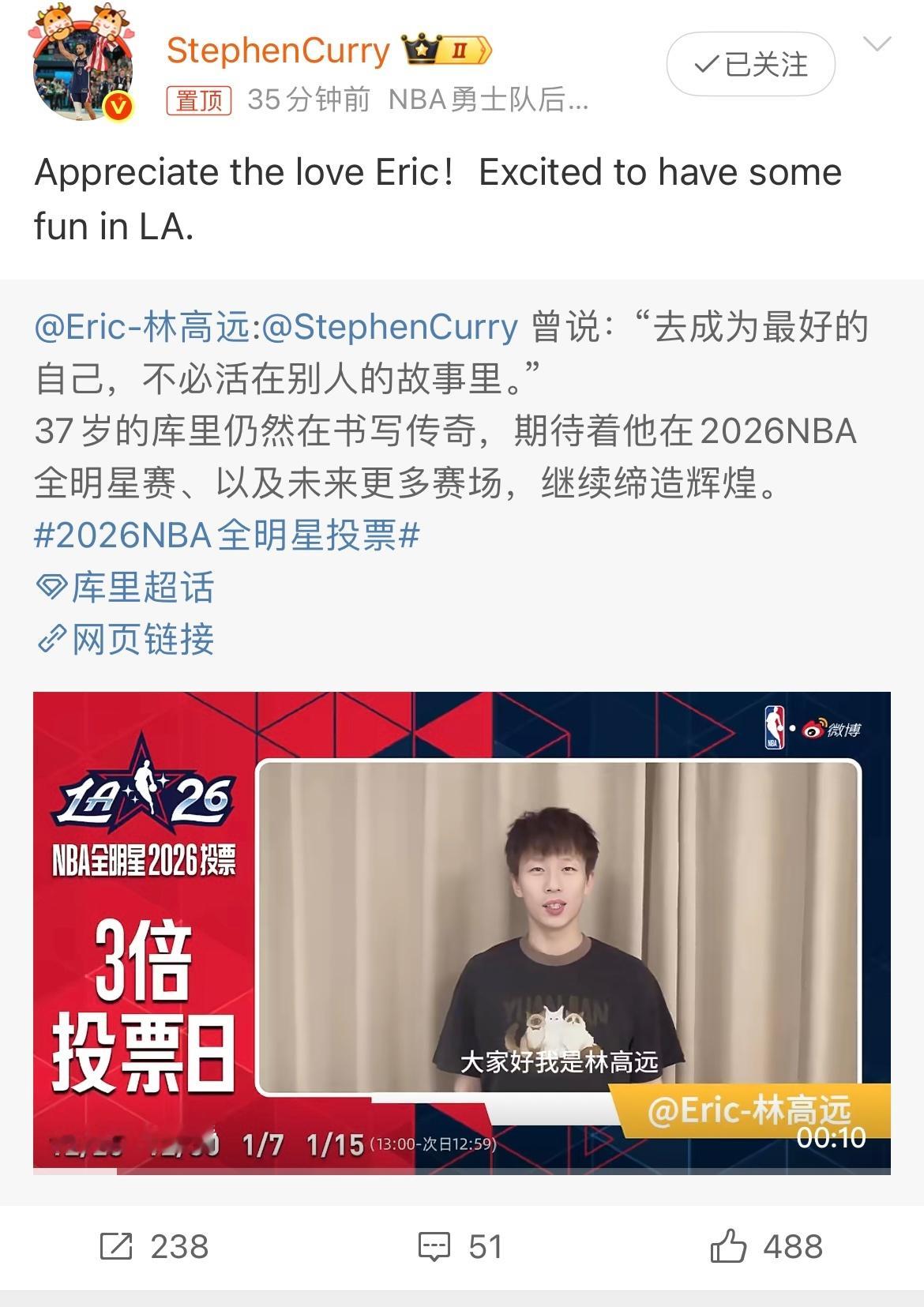 跨界联动!体育无国界!林高远给库里拉票,库里转发并表示感谢,祝福林高远在洛杉矶玩得开心林高远为库里拉票林高远全明星最想看到库里