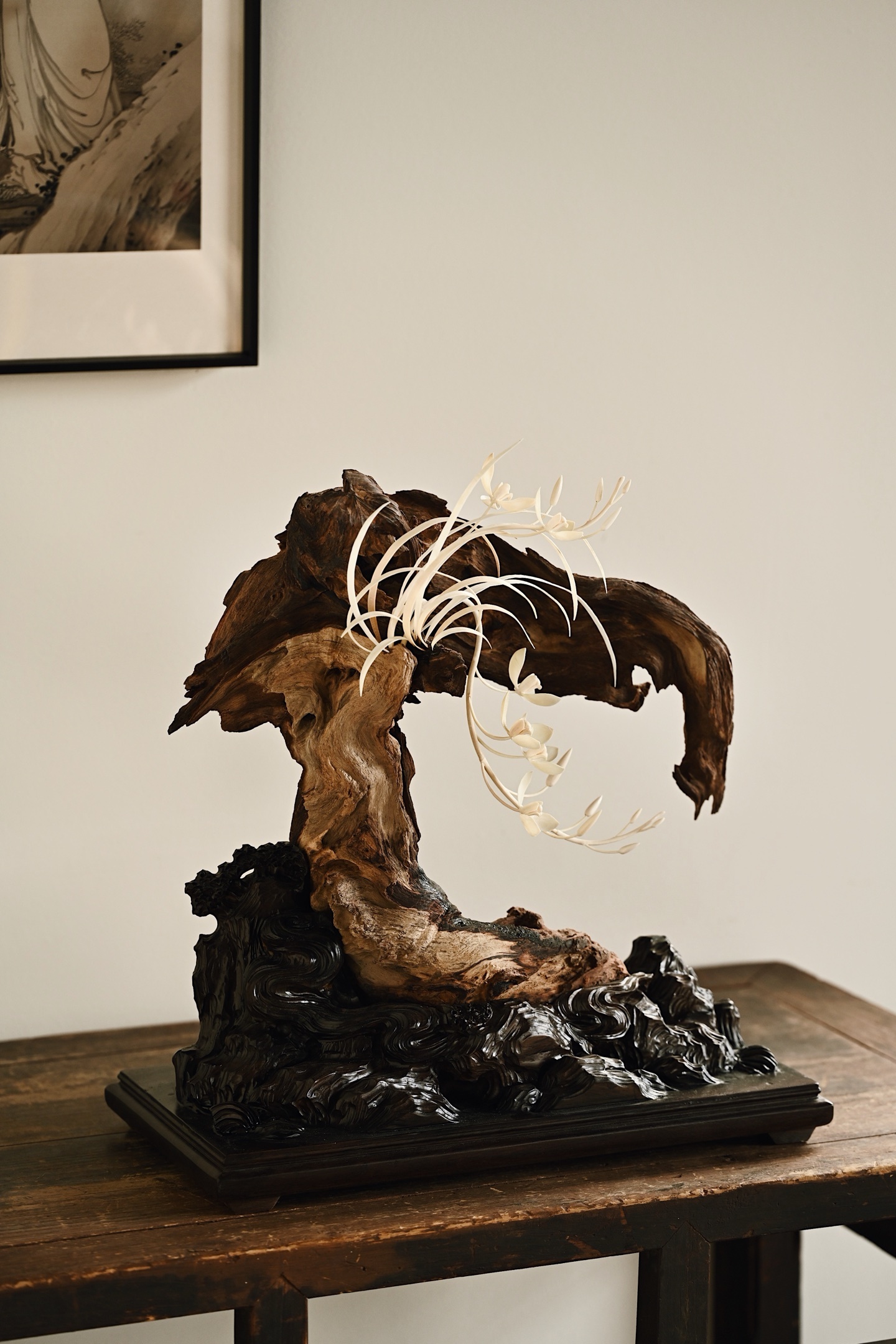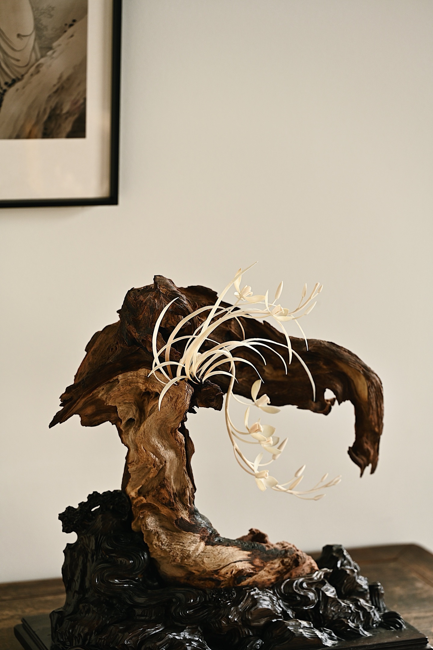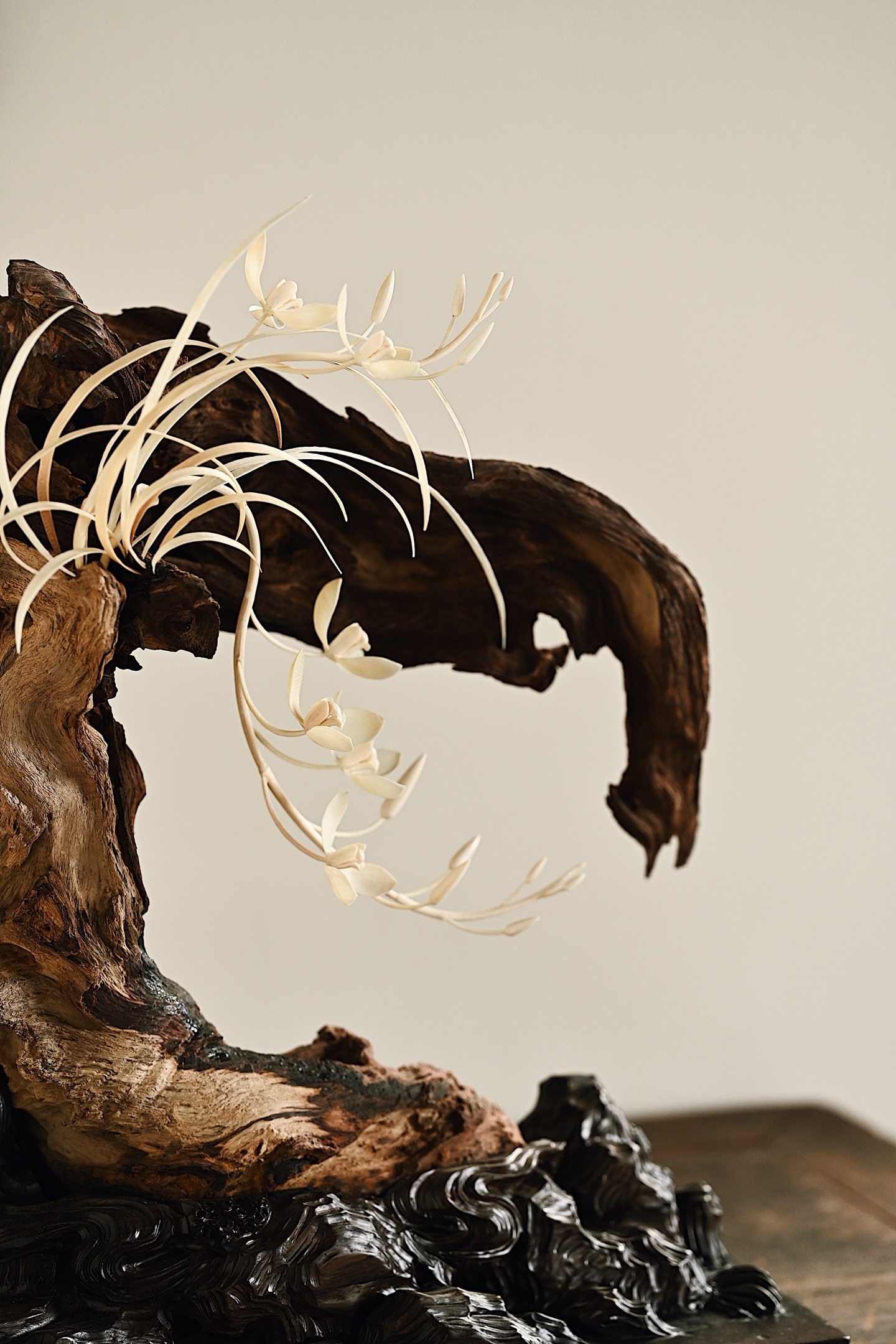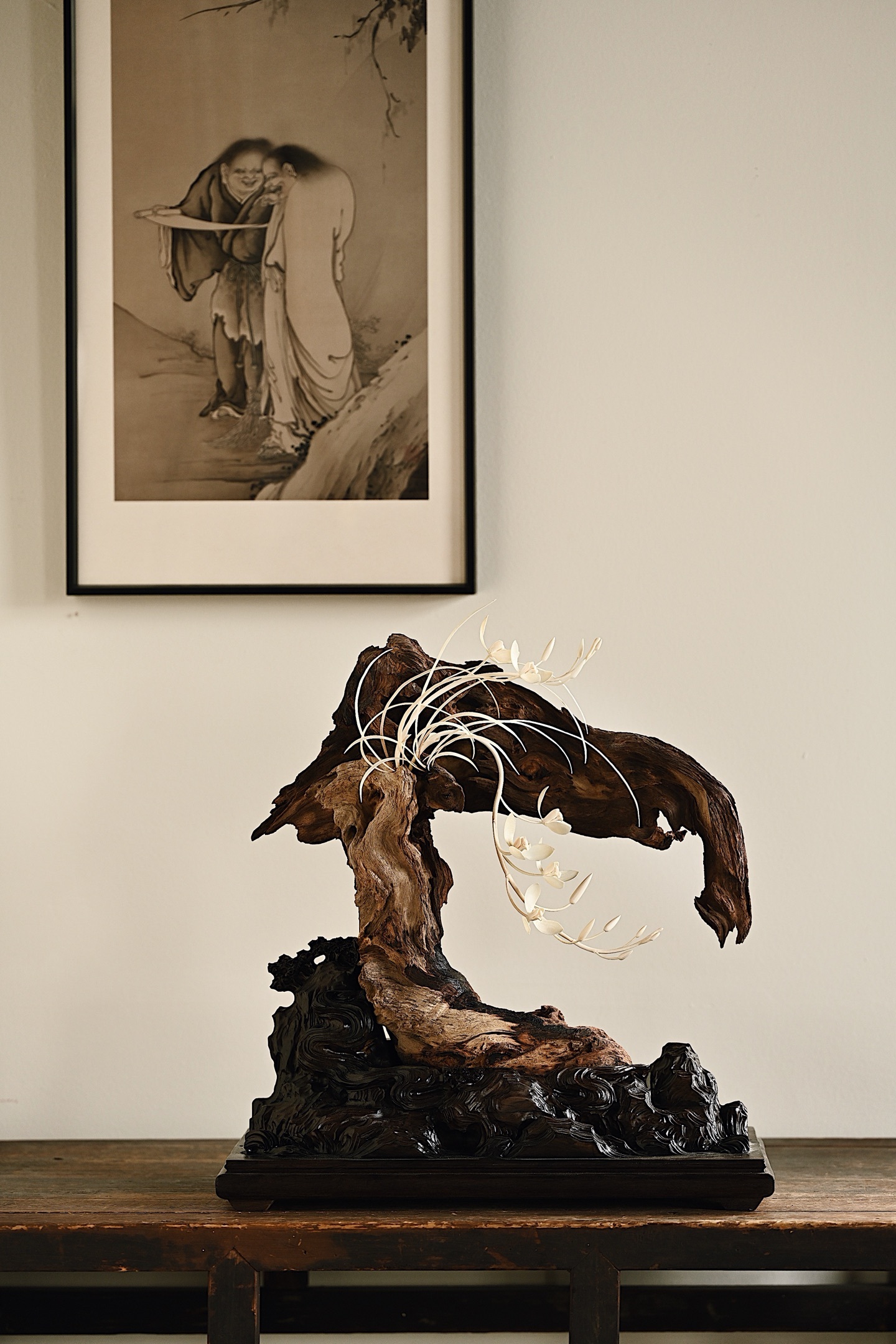 降真香×猛犸 | 蕙风兰香 摆件 天然风化料,取其自然之形,沉稳中不失灵动之势,嵌猛犸兰花,花叶玲珑,布局空灵,与石相衬,文雅非凡。42*22*46cm 7540g