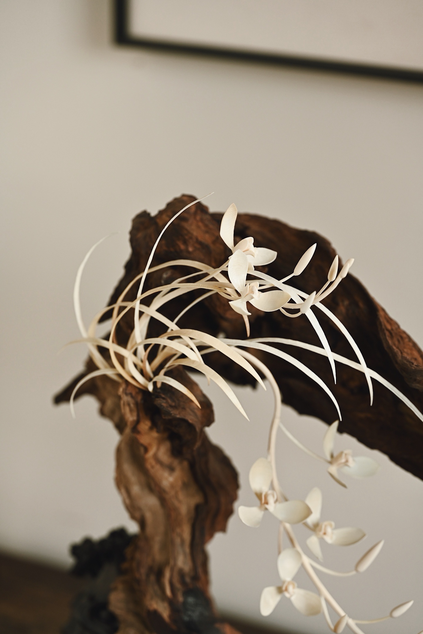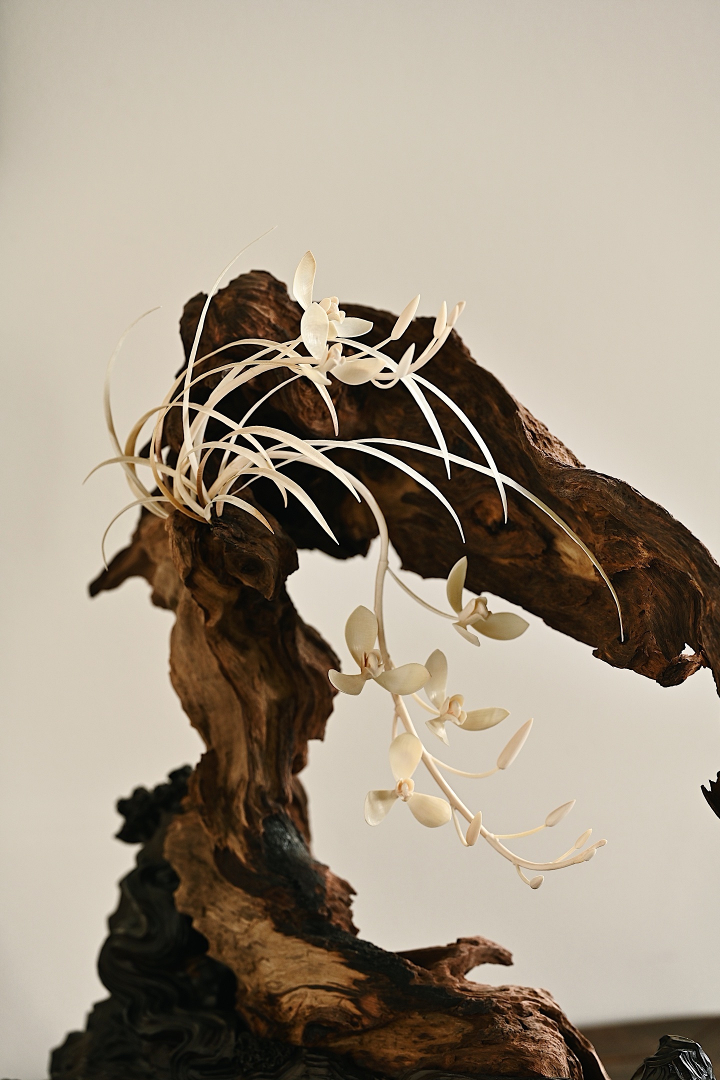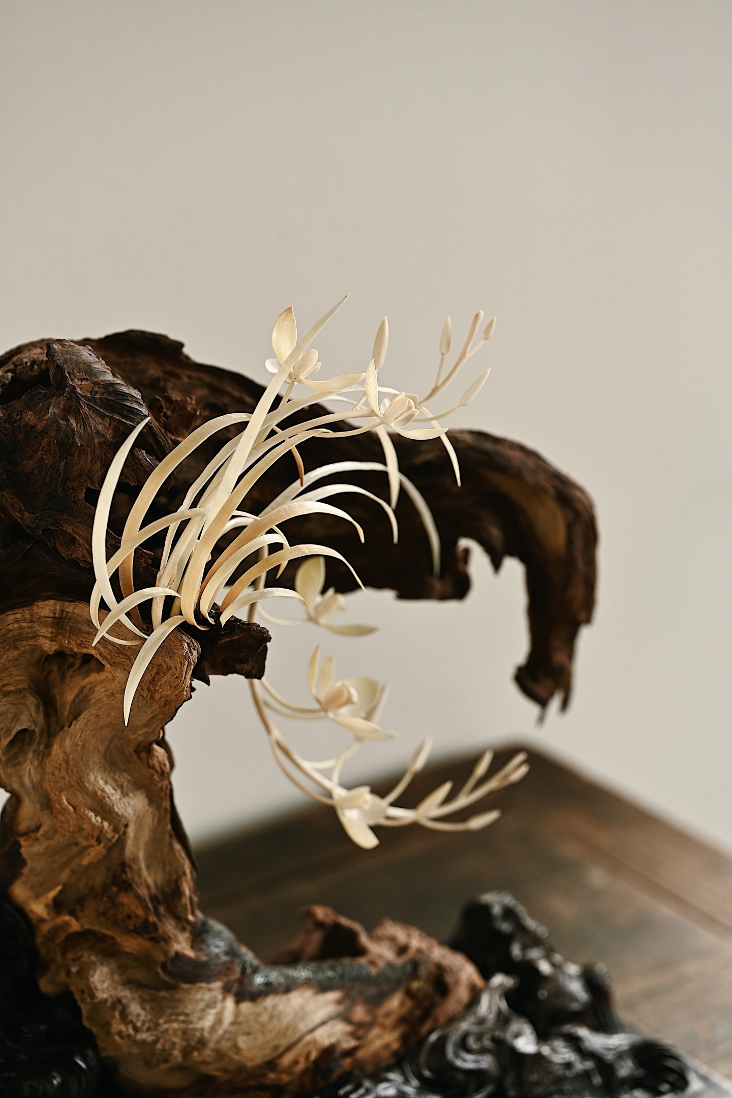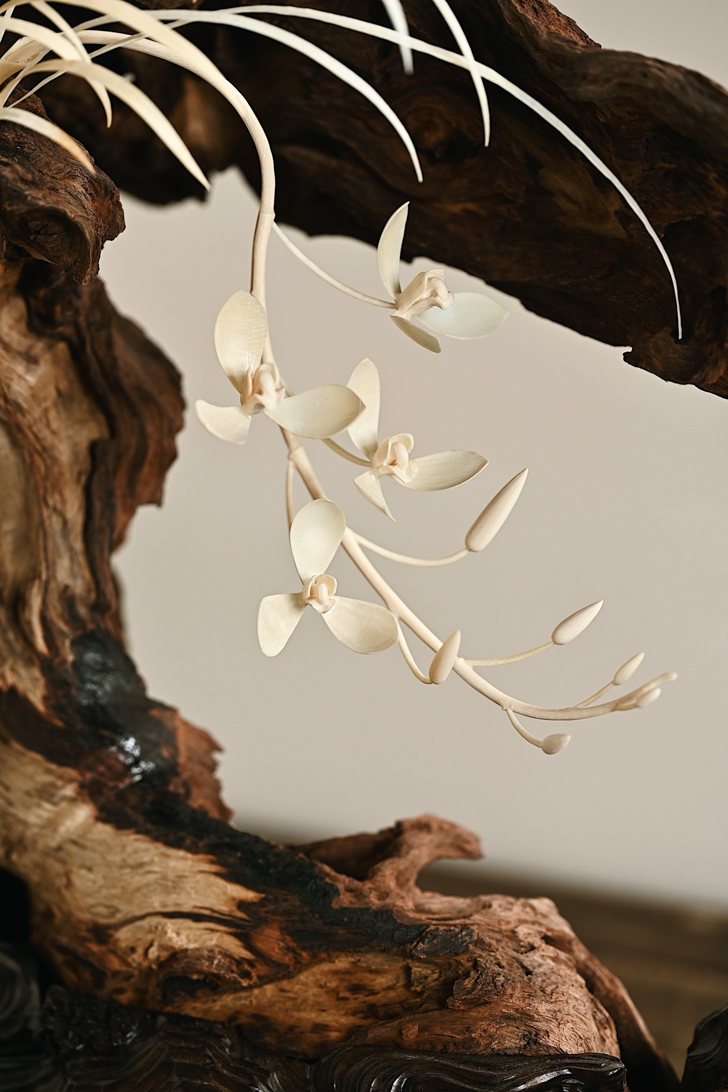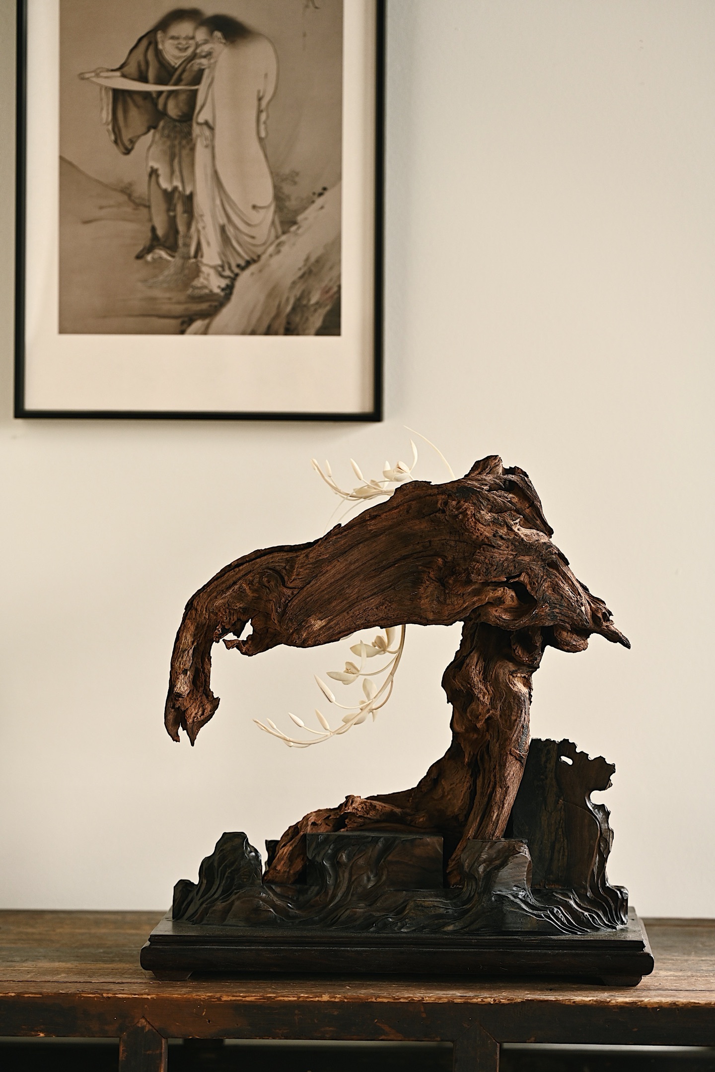 降真香×猛犸 | 蕙风兰香 摆件 天然风化料,取其自然之形,沉稳中不失灵动之势,嵌猛犸兰花,花叶玲珑,布局空灵,与石相衬,文雅非凡。42*22*46cm 7540g