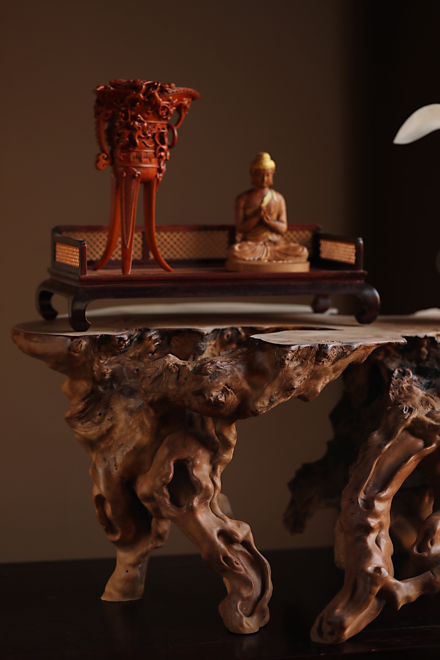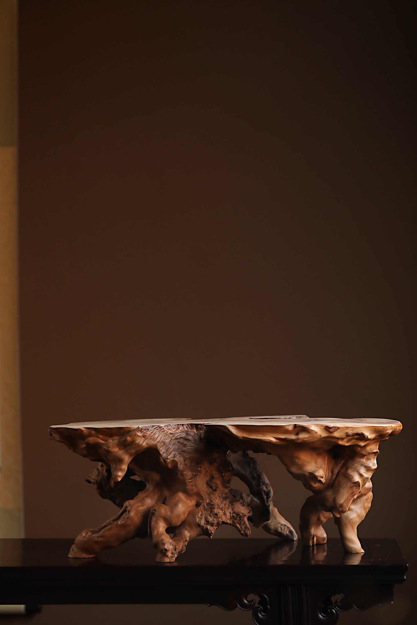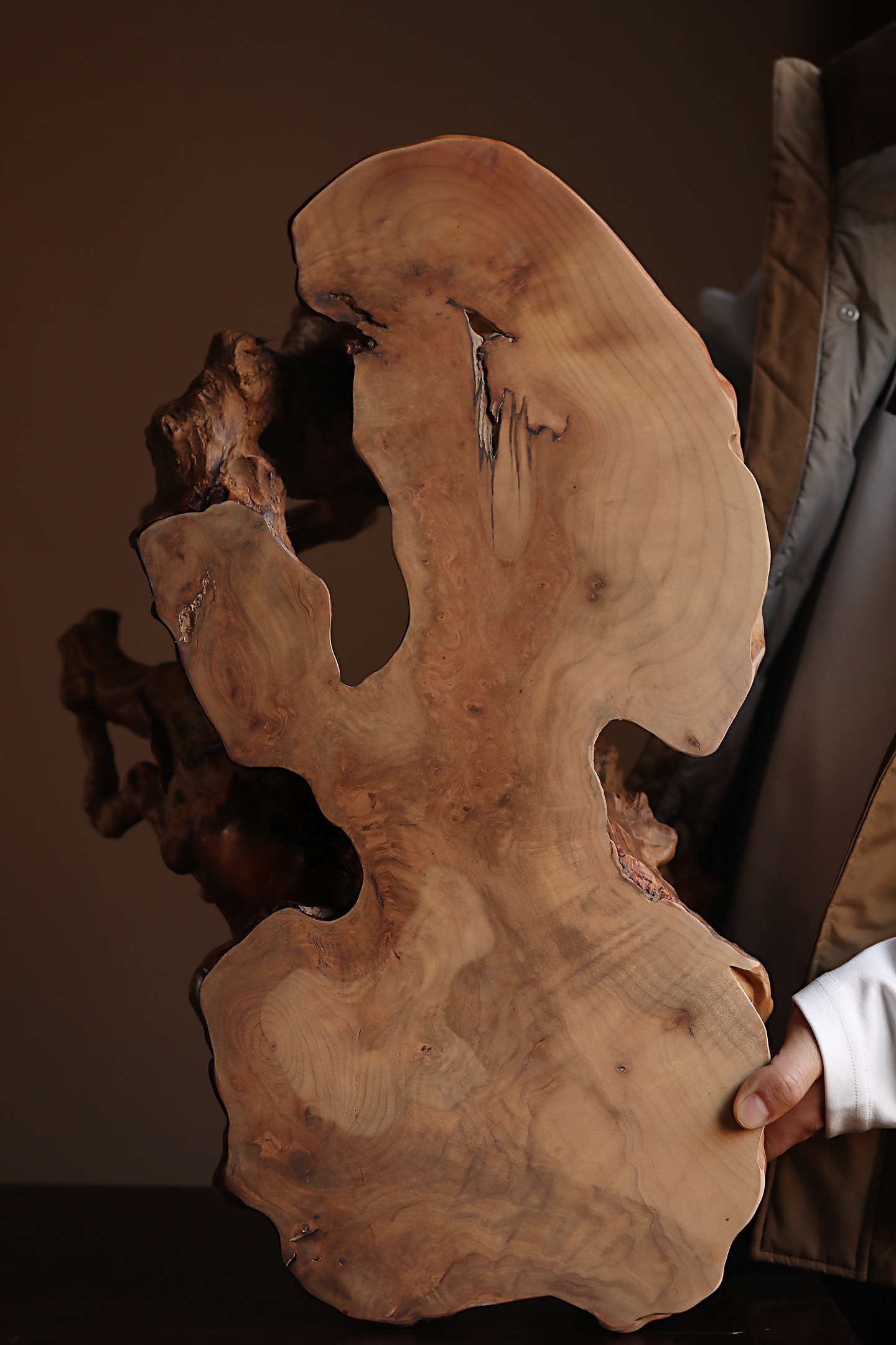 金丝楠木 | 盘根底座取稀有大尺寸老料,依木之天然形韵,全手工精雕而成。整木雕琢仿若古树盘根,虬曲交错,起伏宛转,每一处弯折皆似自然生长而成,浑如天成之作。木纹间金丝隐现,光泽温润雅致,抚之如玉,幽香淡淡。置于案头,可承托盆景、赏石等清供雅物,木之沉稳与石之灵秀相映成趣。其形古朴中见力道,蜿蜒中藏筋骨,不仅是一件器物,更似缩移的山水、凝固的时光,为书房、茶室等文人空间增添一份深邃而宁静的自然意境。63.5*39*24.5cm