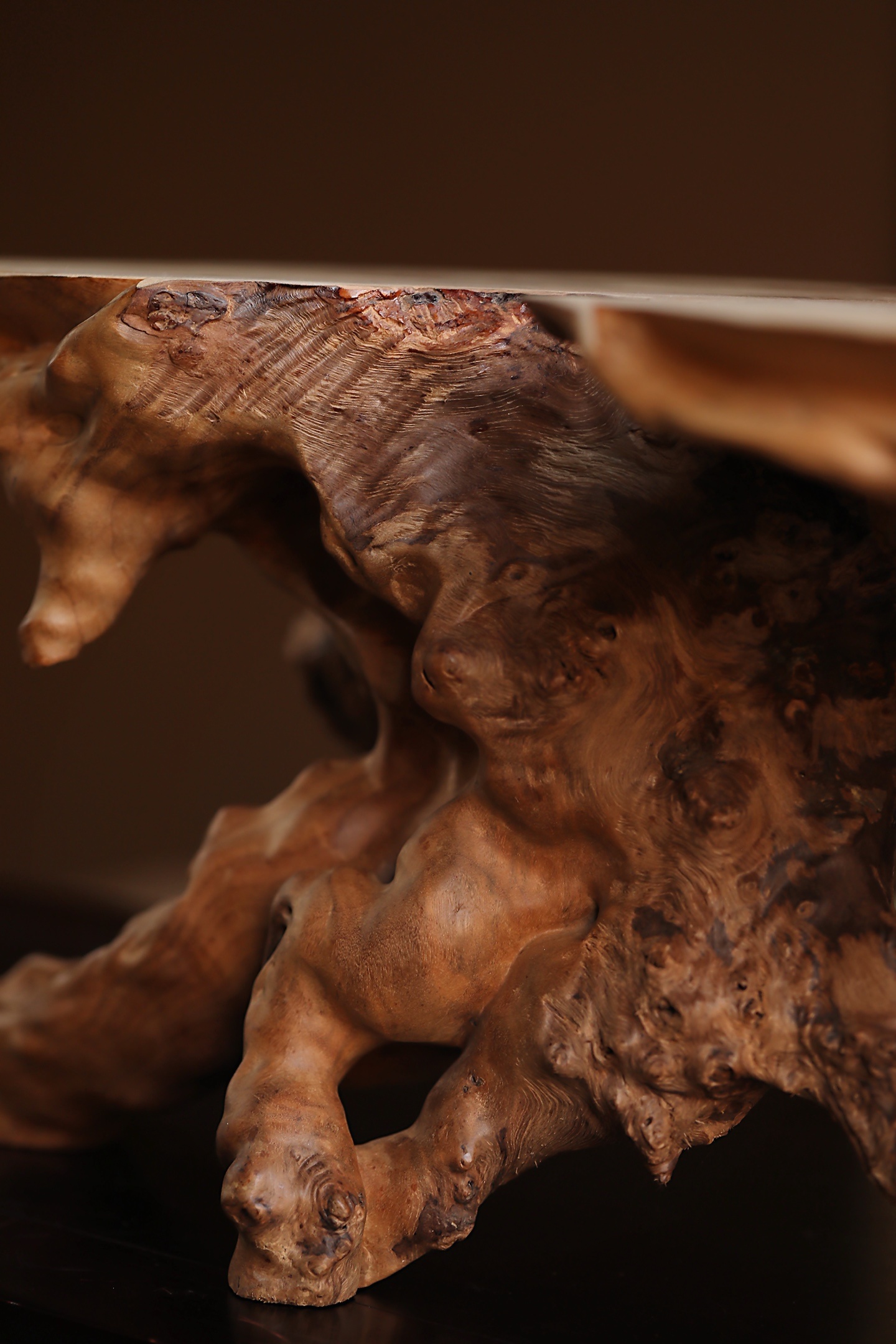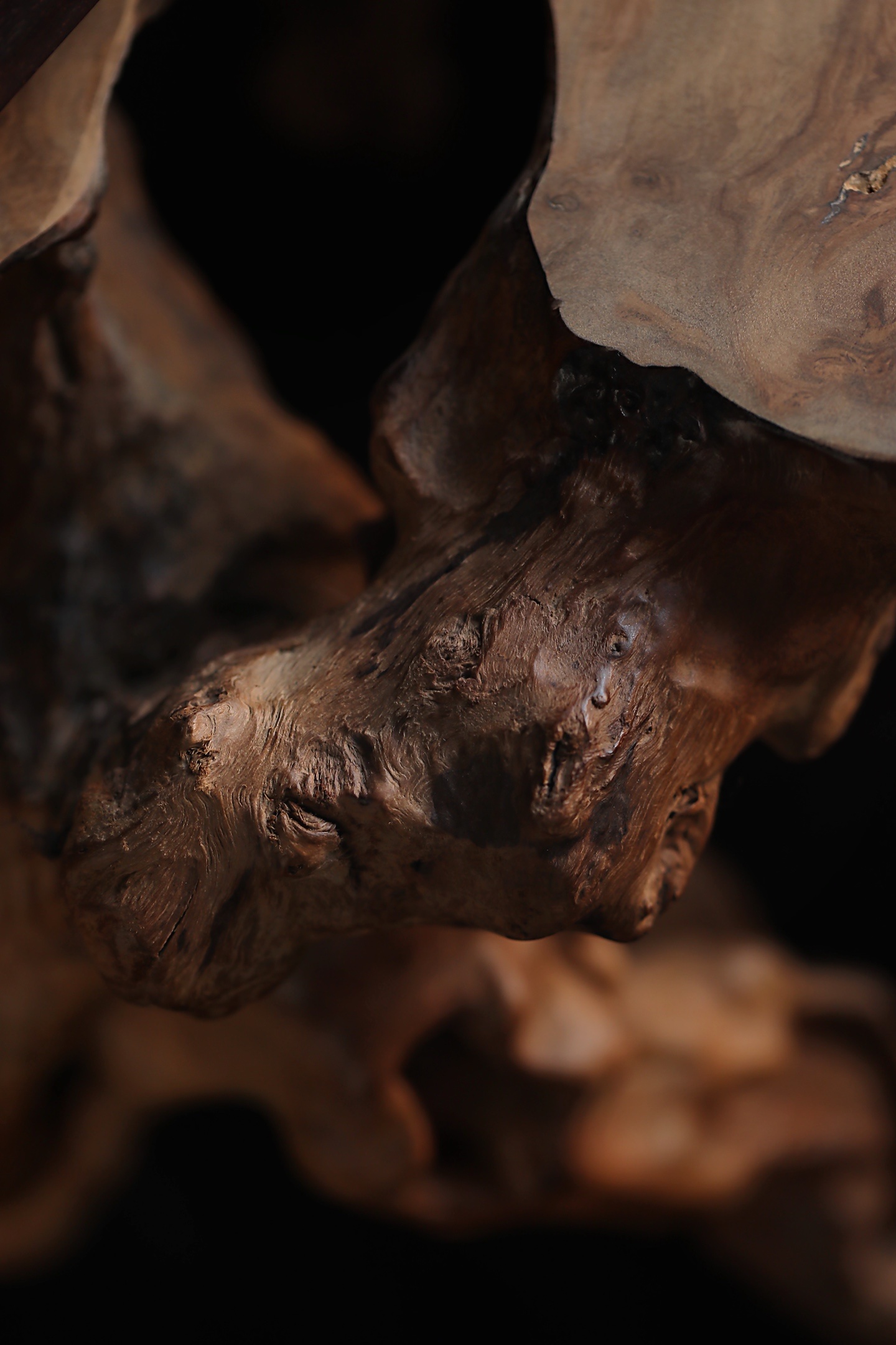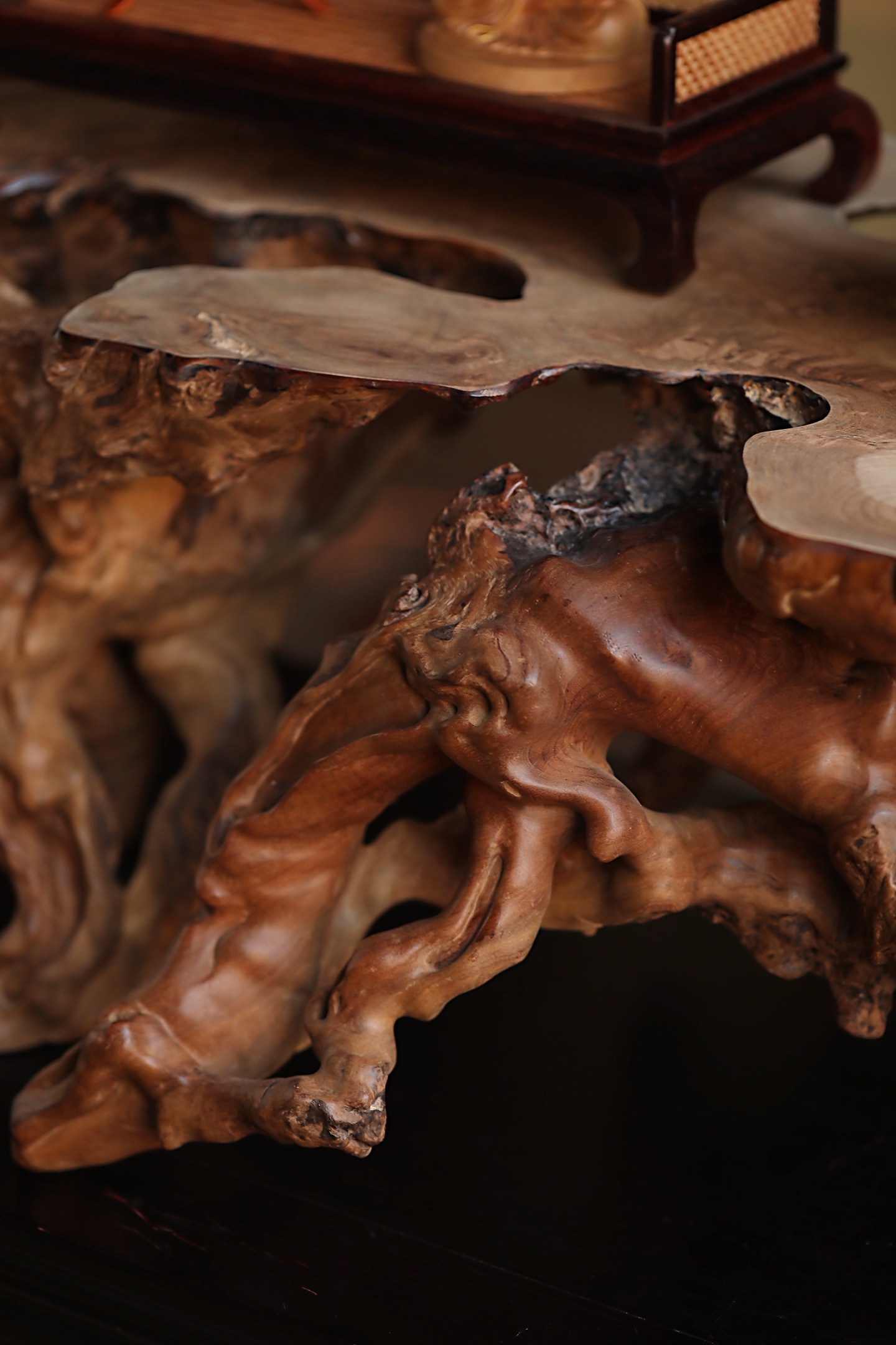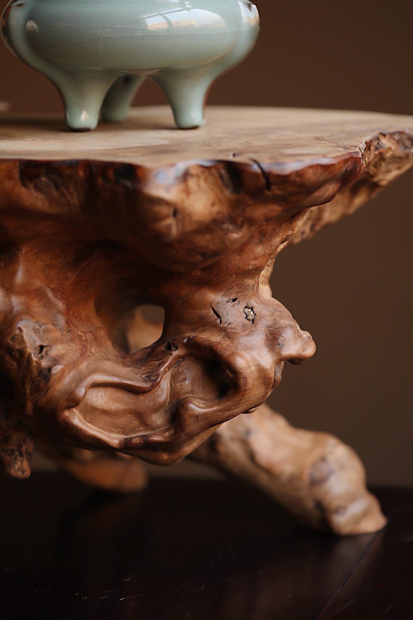 金丝楠木 | 盘根底座取稀有大尺寸老料,依木之天然形韵,全手工精雕而成。整木雕琢仿若古树盘根,虬曲交错,起伏宛转,每一处弯折皆似自然生长而成,浑如天成之作。木纹间金丝隐现,光泽温润雅致,抚之如玉,幽香淡淡。置于案头,可承托盆景、赏石等清供雅物,木之沉稳与石之灵秀相映成趣。其形古朴中见力道,蜿蜒中藏筋骨,不仅是一件器物,更似缩移的山水、凝固的时光,为书房、茶室等文人空间增添一份深邃而宁静的自然意境。63.5*39*24.5cm