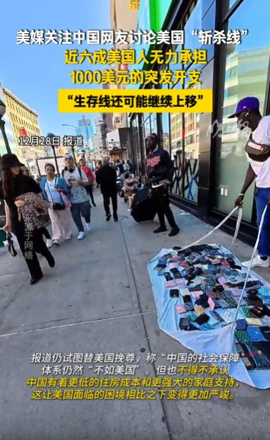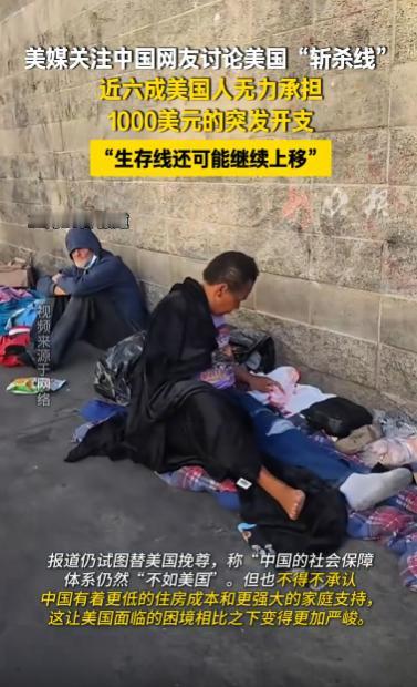 美媒关注中国网友讨论美国"斩杀线",据调查发现,近六成美国人无力承担1000美元的突发开支,"生存线还可能继续上移" 最近,中国网友关于美国“斩杀线”的讨论,引起了美国媒体的关注,这个原本用来形容游戏里角色生命值过低、容易被一击终结的词,被大家用来描述很多美国人的生活状态。 意思就是看似正常的日子其实没什么容错空间,只要遇上一点意外,生活就可能彻底崩盘。 美国《新闻周刊》专门发文提到了这个在中国社交平台上迅速传播的讨论,还认可了这种说法所反映的美国社会现实。 这种讨论并不是空穴来风,有不少权威调查能印证,相关金融机构和银行的调查都显示,很多美国人拿不出一笔不算多的突发开支。 哪怕是汽车出点小故障要修、家里需要紧急维修,或者是一次不在医保全额覆盖范围内的医疗检查,这样的花费都能让不少家庭陷入困境。 有长期住在西雅图的人分享,当地那些年收入没达到一定水平的家庭,日子过得特别吃力,除非不用付房租房贷、不用买医疗保险。 这些家庭几乎没有任何缓冲的余地,一旦遇到失业、家人生病或者离婚这样的变故,很快就会陷入经济危机。 在美国,还有一群被专门定义的人群,他们有工作,甚至可能打两份工,但收入只够勉强覆盖房租和吃饭这些最基本的开销,没什么积蓄,也没什么资产,正好就处于大家说的“斩杀线”边缘。 更让人担忧的是,这条生存线还有继续上移的可能,一方面,这些年美国的住房、食品和医疗费用一直在涨,而收入的涨幅却跟不上。 另一方面,相关政策调整还在削减医疗方面的投入,这让原本就艰难的家庭可能面临更大的压力。 美媒在报道里也不得不承认,和中国相比,美国的住房成本更高,家庭抵抗风险的能力也更弱。 中国网友的讨论之所以能引起美媒关注,核心就是大家发现,曾经被不少人认为生活富足的美国,其实有大量普通人正处在生活的悬崖边缘,而这条悬崖线还在不断升高,让更多人的生活失去保障。 以上都是个人观点,对此您有什么不同的看法,可以在评论区留言讨论!!!
