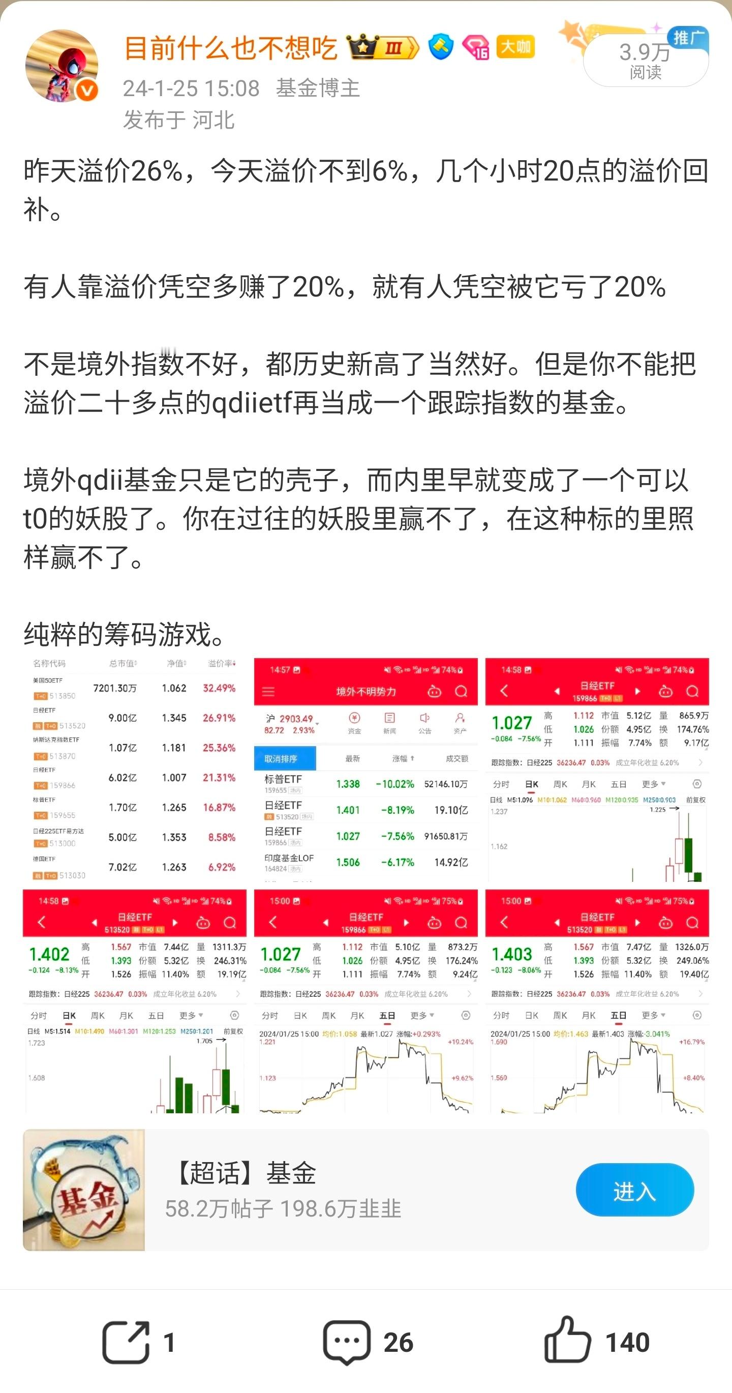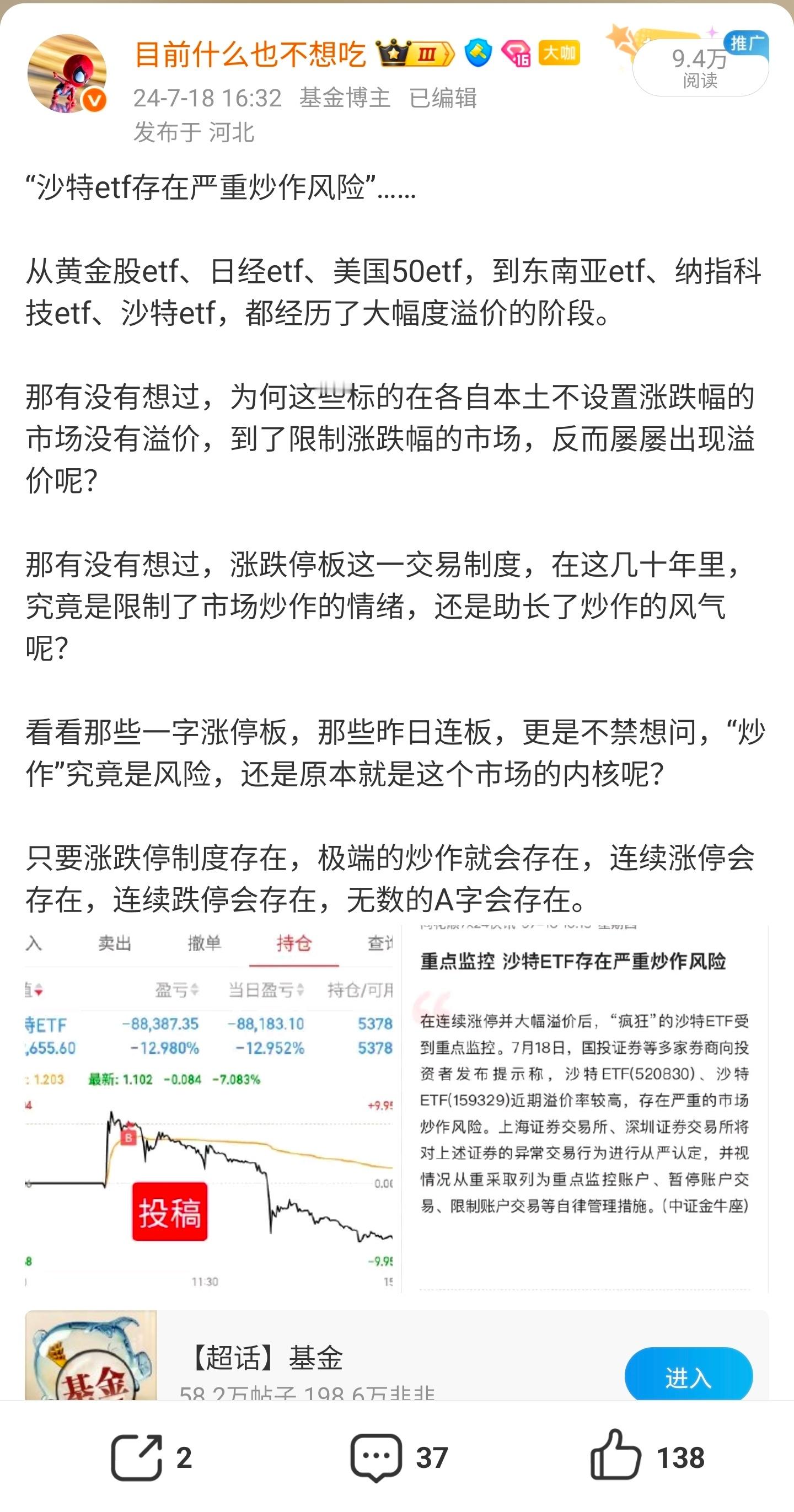 不设置涨跌幅的市场,没人敢对基金产品做无视净值的溢价拉升。反而有涨跌幅限制的市场,你会看到各种大涨大跌,急上急下,因为这就是纯粹的筹码博弈。只要市场有涨跌停这一规则限制,就必然会存在溢价炒作的基金产品,过去有,现在有,将来也还会有。从原油lof、黄金etf、德国etf、美国50etf、日经225etf,到白银lof以及这几天的各类小盘lof,各个溢价炒作轮番登场,变的是不同品种,但不变的还是筹码本质。