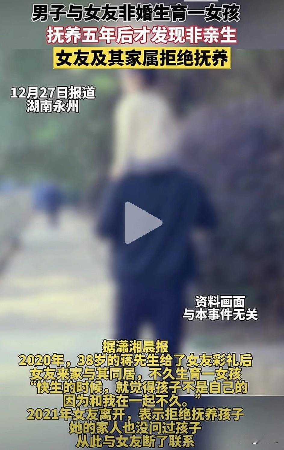 “养了5年的女儿非亲生”!永州男子寻亲公告看哭全网:彩礼没了,娃是我的!网友:这是现实版的《人世间》? 湖南永州一位蒋先生最近有点“懵”: 自己养了5年的女儿,上户口做亲子鉴定,结果发现——真不是亲生的! 故事得从2020年说起,38岁的蒋先生和当时25岁的女友非婚生下一女。 其实孩子快出生时,他就隐约觉得“时间对不上”,果然,鉴定结果印证了猜想。 2021年两人分手,女友一去不回,孩子却留给了他。 “养了这么久,有感情了!” 如今孩子快上小学,为办户口不得不登报寻亲。蒋先生心酸又实在:“亲父母找到就协商,找不到我就申请领养,继续养她长大。” 他如今在东莞打工,女儿在老家由母亲照顾,生活不易,却没想过放弃孩子。 当地民政部门回应:孩子亲生父母“应该能找到”,其行为可能已涉嫌遗弃。而蒋先生想领养也很难——异性收养需满足年龄差40岁等严苛条件。 网友一边心疼一边吐槽: “这是现实版《人世间》?” “女友:孩子你养,彩礼不退!” “孩子最可怜,幸好养父有担当!” “女人拥有子宫,未必拥有道德和良心!!” “建议所有婴儿出生上幼儿园和成年都做亲子鉴定后存档!” “果然不是谁的妈妈都能叫妈妈!” “道德制约不了人性,婚检还是有必要的我觉得,要不然以后这样的事儿会越来越多!” “亲子鉴定纳入出生证明!” 如今寻亲公告已发,结局如何尚未可知。但蒋先生这份“明知非亲生,仍愿护一生”的情义,已让无数人动容。 愿孩子早日有户口,愿真心不负人。 素材来源:热度新闻,侵联删!