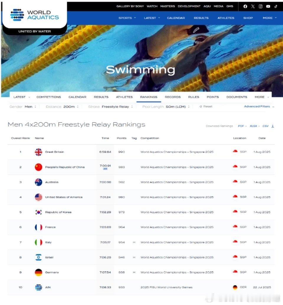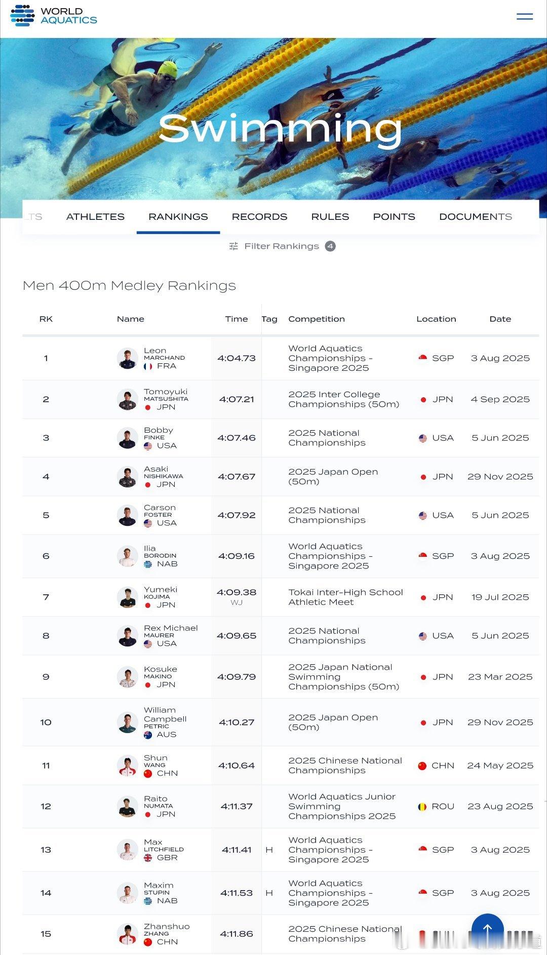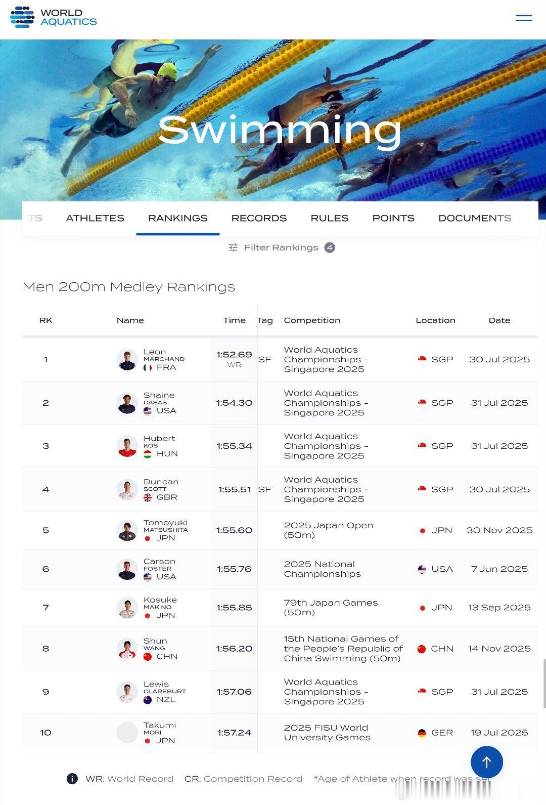 【你好新的一周】总结2025|根据世界泳联官网统计数据,在截止目前的2025年度游泳各项目最佳排名,以及游泳各项目历史最佳排名中,中国游泳选手汪顺,凭借在2025年第十五届全运会决赛游出的200米个人混合泳 1:56.20 的成绩排名年度第8 (p2),在2025年全国游泳冠军赛游出的400米个人混合泳4:10.64的成绩,排名该项目年度第11 (p3)在接力项目方面,中国游泳选手汪顺 季新杰 潘展乐 张展硕 在新加坡世锦赛上取得的男子4x200米自由泳接力 7:00.91 的亚军成绩,排名该项目历史最佳第五名,和2025年度的第2名。(p4、5、6) 汪顺的2026汪顺的2025年度回顾顺流而上游泳p1图/新华社