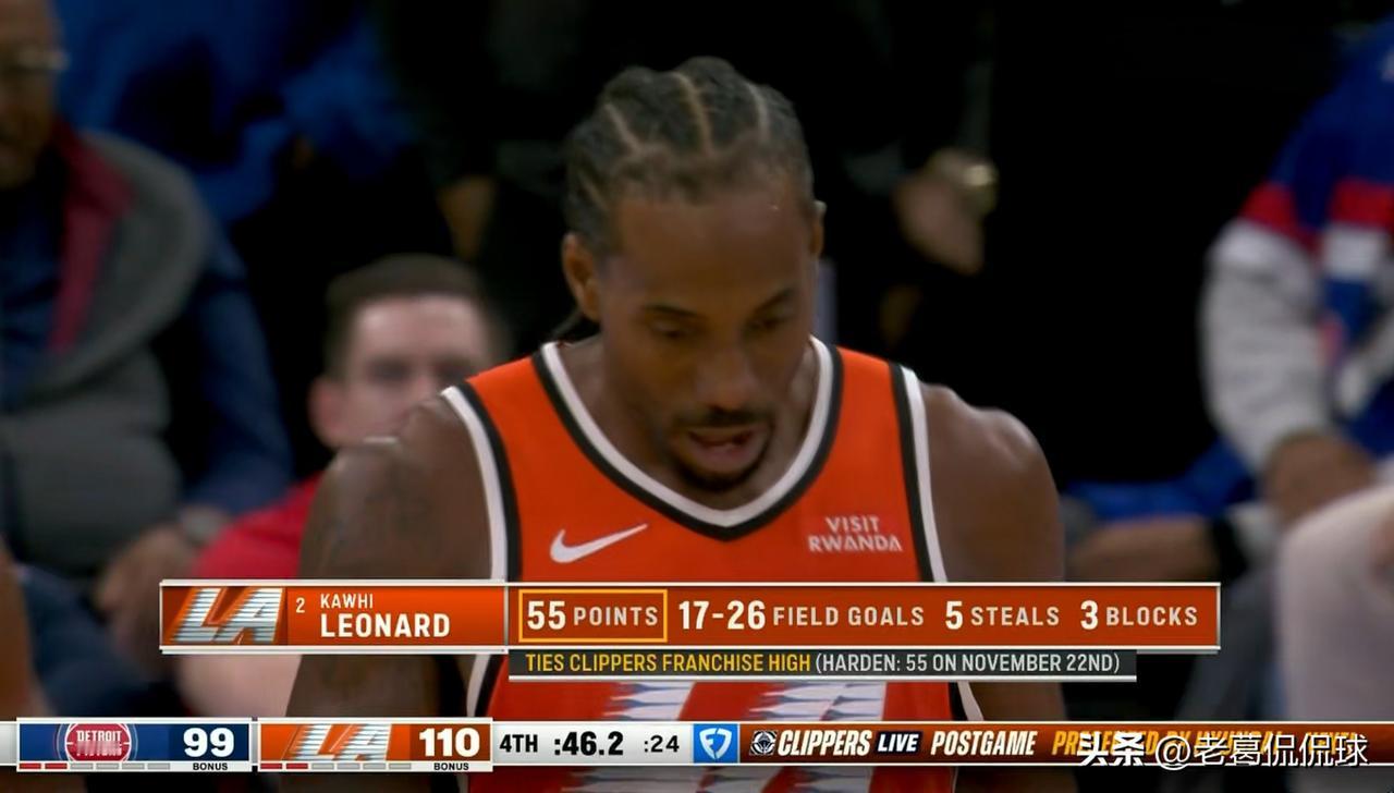 快船当家球星伦纳德真是太懂事了!在今天进行的快船和活塞的比赛中,当时比赛进行到了第四节的最后时刻,伦纳德已经得到了55分,这样的话伦纳德就追平了此前由哈登创造的队史得分记录,距离创造新的队史得分记录仅有一步之遥。可惜的是,伦纳德随后被替换下场休息,这样的话伦纳德就和哈登共享队史的得分记录。 不得不说伦纳德真是太懂事了,因为伦纳德完全有机会创造新的队史得分记录,但是他选择了拒绝。