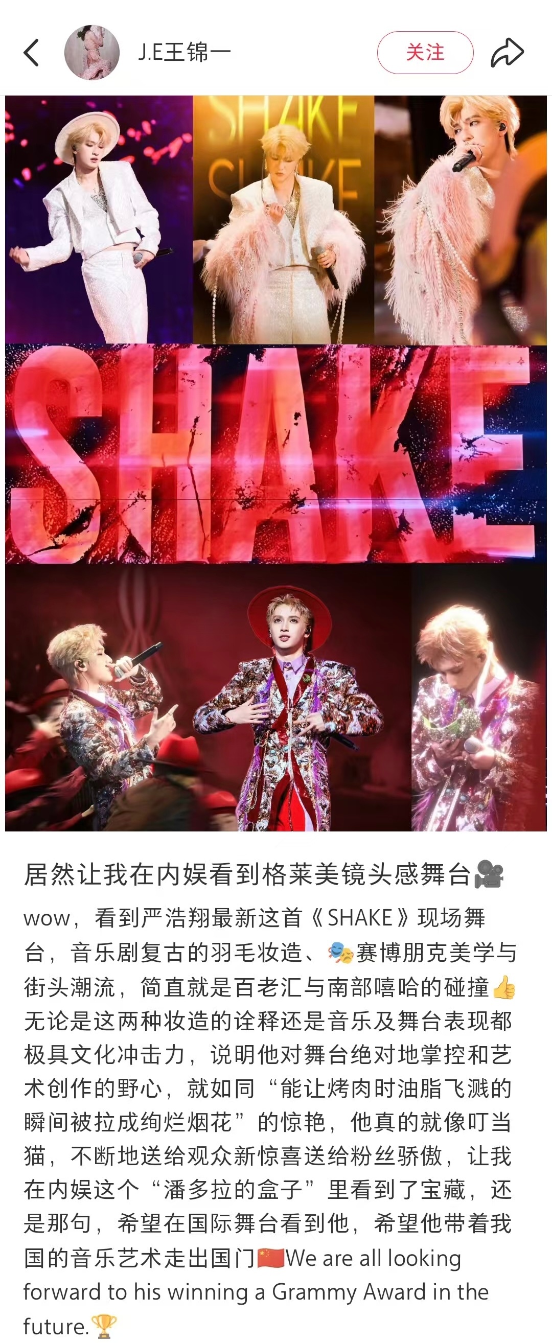 “居然让我在内娱看到格莱美镜头感舞台”“亚洲Idol里的“时尚鬼才””“这张中国🇨🇳面孔不出现在国际是有多可惜”三次极高的评价…“能让烤肉时油脂飞溅的瞬间被拉成绚烂烟花”来形容shake超级贴切,以完全领先的审美在做音乐做舞台。打败严浩翔的只可能是下次的严浩翔,内娱这和潘多拉盒子里严浩翔是独一无二的宝藏,我们也在期待他登上国际舞台的那一天🥹严浩翔 yanstyle 严浩翔