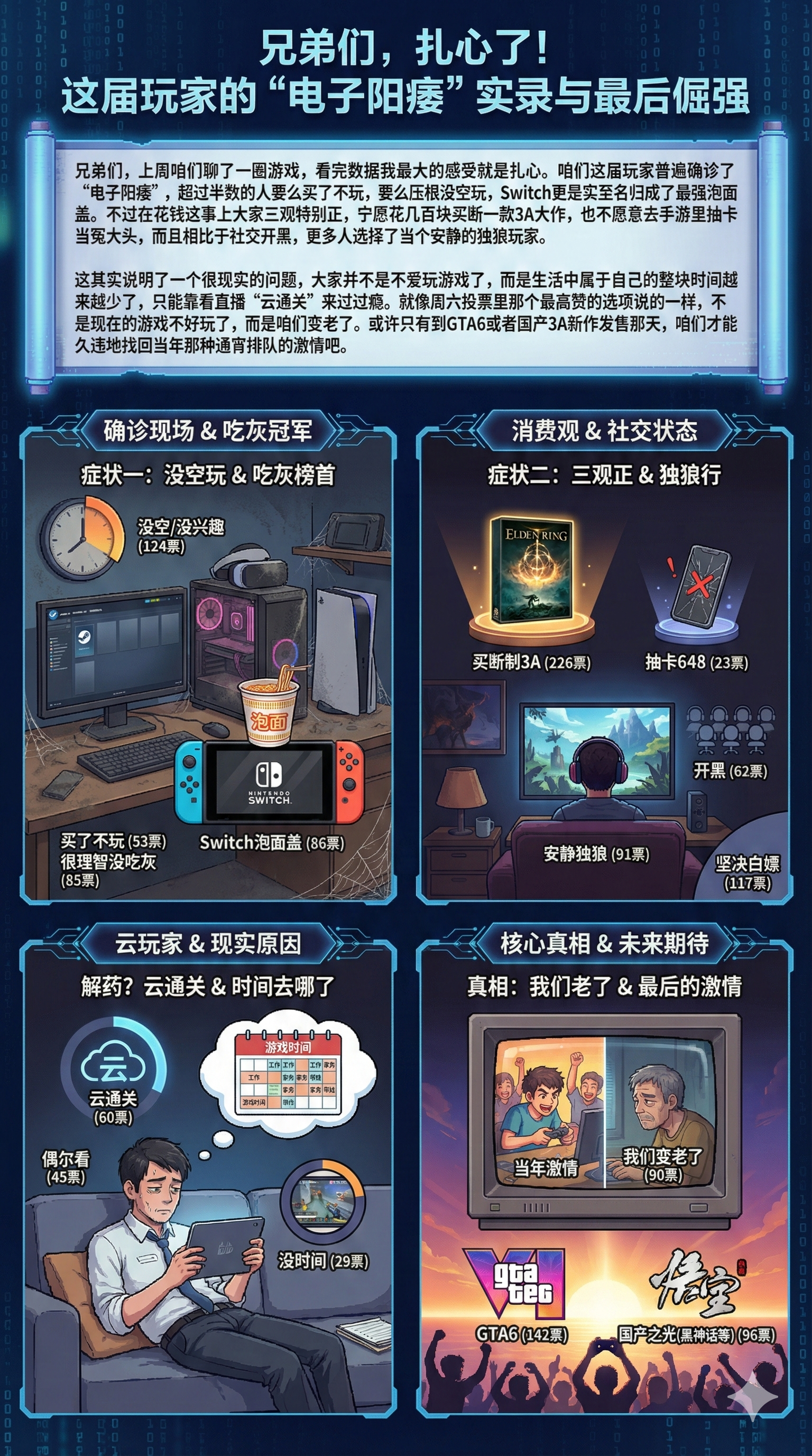 上周咱们聊了一圈游戏,看完数据我最大的感受就是扎心。 咱们这届玩家普遍确诊了“电子阳痿”,超过半数的人要么买了不玩,要么压根没空玩,Switch更是实至名归成了最强泡面盖。不过在花钱这事上大家三观特别正,宁愿花几百块买断一款3A大作,也不愿意去手游里抽卡当冤大头,而且相比于社交开黑,更多人选择了当个安静的独狼玩家。这其实说明了一个很现实的问题,大家并不是不爱玩游戏了,而是生活中属于自己的整块时间越来越少了,只能靠看直播“云通关”来过过瘾。就像周六投票里那个最高赞的选项说的一样,不是现在的游戏不好玩了,而是咱们变老了。或许只有等到GTA6或者国产3A新作发售那天,咱们才能久违地找回当年那种激情吧。