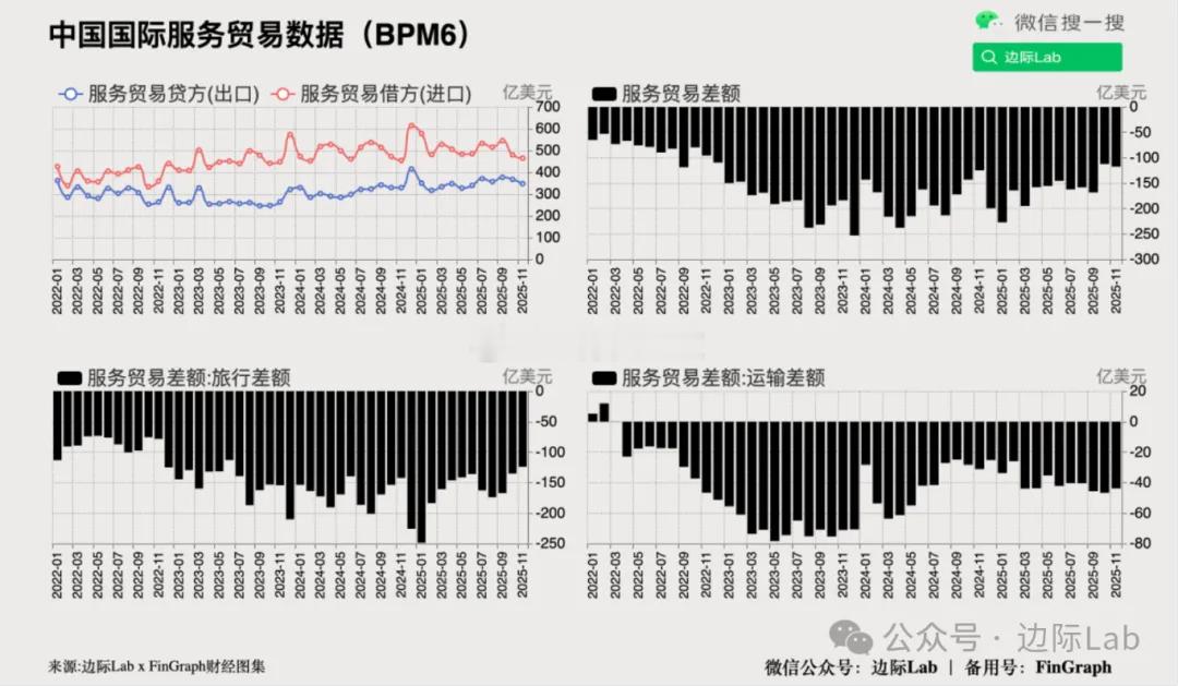 中国11月服务贸易出口347.37亿美元,同比增长5.47%;进口464.79亿美元,同比增长2.34%。当月服务贸易逆差收窄至117.42亿美元,较去年同期的124.8亿美元小幅下降。其中,旅行账户逆差录得124.03亿美元,较去年同期的142.28亿美元有所减少;运输账户逆差则扩大至43.77亿美元,高于去年同期的31.12亿美元。来源:边际Lab x FinGraph财经图集