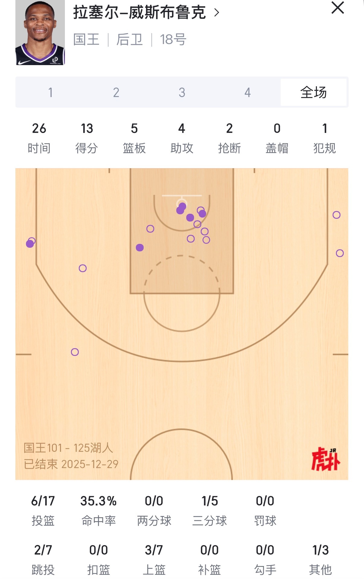 一名场边的湖人球迷与威斯布鲁克发生口角后被请出场,因为球迷在场边喊他westbrick。威少今天全场17中6拿下13分5篮板4助攻2抢断,没打痛快肯定要找个黑子对喷一下湖人战胜国王国王vs湖人