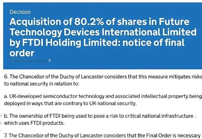[太阳]英国又出手了!继荷兰强夺中资持有的安世半导体之后,伦敦也以“国家安全”为名,逼迫中国建广资产交出其在FTDI公司80.2%的股权。 要搞清楚这事儿的来龙去脉,得先说说FTDI这家公司,FTDI是英国本土一家专注于USB芯片及接口解决方案的半导体企业,产品广泛应用在工业控制、消费电子等多个领域,在全球相关细分市场拥有不小的市场份额和行业话语权。 数年前,中国建广资产通过合规流程完成了对该公司多数股权的收购,整个并购过程完全遵循英国及欧盟当时的相关法律规定,不存在任何违规操作。 收购完成后,建广资产持续为FTDI注入资金支持,助力企业拓展海外市场、推进技术研发,推动这家英国本土企业实现了业务的稳步增长,这原本是一场跨国投资互利共赢的典型案例。 让人没想到的是,英国政府突然打破了这种稳定的合作局面,毫无征兆地以“国家安全”为由向建广资产施压。 按照英国官方给出的要求,建广资产必须在规定期限内剥离所持有的FTDI全部股权,而且股权转让的对象还需要经过英国政府的审核批准。 这种要求不仅直接限制了中资企业自主处置资产的合法权利,也完全没有拿出任何切实可信的证据,来证明中资持有FTDI股权确实对英国国家安全构成了威胁。所谓的“国家安全”理由,更像是一种借口。 熟悉国际投资规则的人都清楚,英国此次的操作已经打破了国际并购市场长期遵循的公平原则和信任基础,事实上,类似的情况之前在荷兰也曾发生过。 中资企业通过合规流程收购安世半导体后,荷兰政府同样突然以“影响供应链安全”为由介入干预,最终迫使中资转让了部分股权。 这两起事件接连发生,不难看出欧洲部分国家在半导体等核心产业领域,对中资企业存在着明显的警惕甚至遏制心态,当下全球半导体产业竞争日趋激烈,芯片作为数字经济发展的核心基石,已经成为各国产业博弈的战略焦点。 欧洲部分国家既想守住本土核心产业的优势地位,又担心中资企业通过跨国并购获取相关技术、扩大行业影响力,于是就频繁动用“国家安全”这一工具,干预正常的商业投资活动。 但这种做法往往得不偿失,短期来看或许能达到所谓的“产业保护”目的,长期来看却会严重损害自身的投资环境和国际声誉。 对中国建广资产来说,此次被迫剥离股权将面临实实在在的经济损失,包括前期投入的并购资金、多年来的运营收益,还有企业未来的增值空间。 更深远的影响在于,这种不确定性会让其他计划布局欧洲市场的中资企业更加谨慎,不得不重新评估当地的政策风险和合规成本,毕竟,没有哪家企业愿意在一个投资环境不稳定、政策缺乏连贯性的市场里投入大量资源。 面对英国政府的不合理施压,中国建广资产并没有被动接受,而是积极通过法律途径维护自身的合法权益,同时也在尝试与英国官方进行沟通协商,希望能寻求到一个更合理的解决方案。 中国外交部也已经就此事件表明了立场,敦促英国政府尊重市场规律和公平竞争原则,停止以“国家安全”为借口干预正常的商业合作,为中资企业提供一个公平、透明、可预期的投资环境。 国际社会对英国的这一做法也表达了担忧,不少跨国企业和行业协会都认为,随意以“国家安全”为由限制外资并购,不仅会破坏全球产业链和供应链的稳定性,还会削弱欧洲市场对全球资本的吸引力。 在经济全球化的大背景下,企业跨国并购原本是优化全球资源配置、促进产业升级的正常商业行为,将正常的商业活动过度政治化解读,最终只会反噬自身。 值得注意的是,英国此次的操作也暴露了其产业政策中的矛盾性,一方面,英国政府一直在积极吸引全球资本,希望借助外资的力量助力本土产业发展,提升半导体等核心领域的竞争力。 另一方面,又出于地缘政治考量,对中资企业采取歧视性的限制措施,这种自相矛盾的做法,只会让全球投资者望而却步,最终影响的还是英国本土产业的长远发展。 事实上,中资企业在欧洲的投资大多集中在实体经济领域,不仅为当地带来了急需的资金和技术支持,还创造了大量的就业岗位,直接促进了当地的经济发展。 除了建广资产对FTDI的投资,不少中资企业在欧洲的制造业、新能源等领域的投资项目,都为当地社区发展、产业升级作出了积极贡献,这种双赢的合作模式,本应得到支持和鼓励,而不是被无端干预和破坏。 对中国企业而言,此次事件也是一次重要的风险警示,在推进海外布局的过程中,需要进一步加强前期的风险评估,深入了解当地的政策法规和地缘政治环境,做好合规管理和风险应对预案,才能更好地保障自身的合法权益。 同时,这也提醒中国企业,要不断提升核心技术自主研发能力,增强在全球产业链中的核心竞争力,从根本上降低外部环境变化带来的风险。 信源:英国又出手了!继荷兰强夺中资持有的安世半导体之后-财经老手