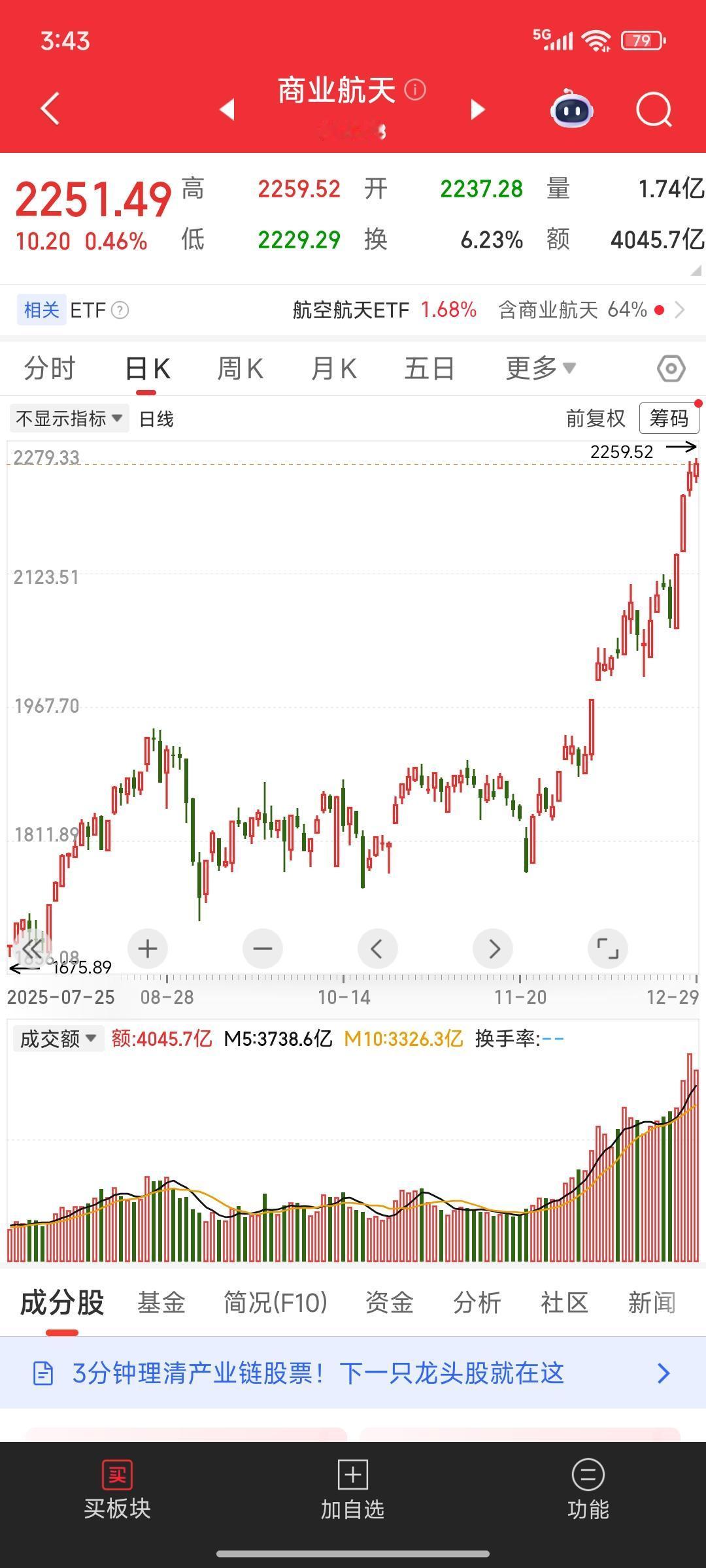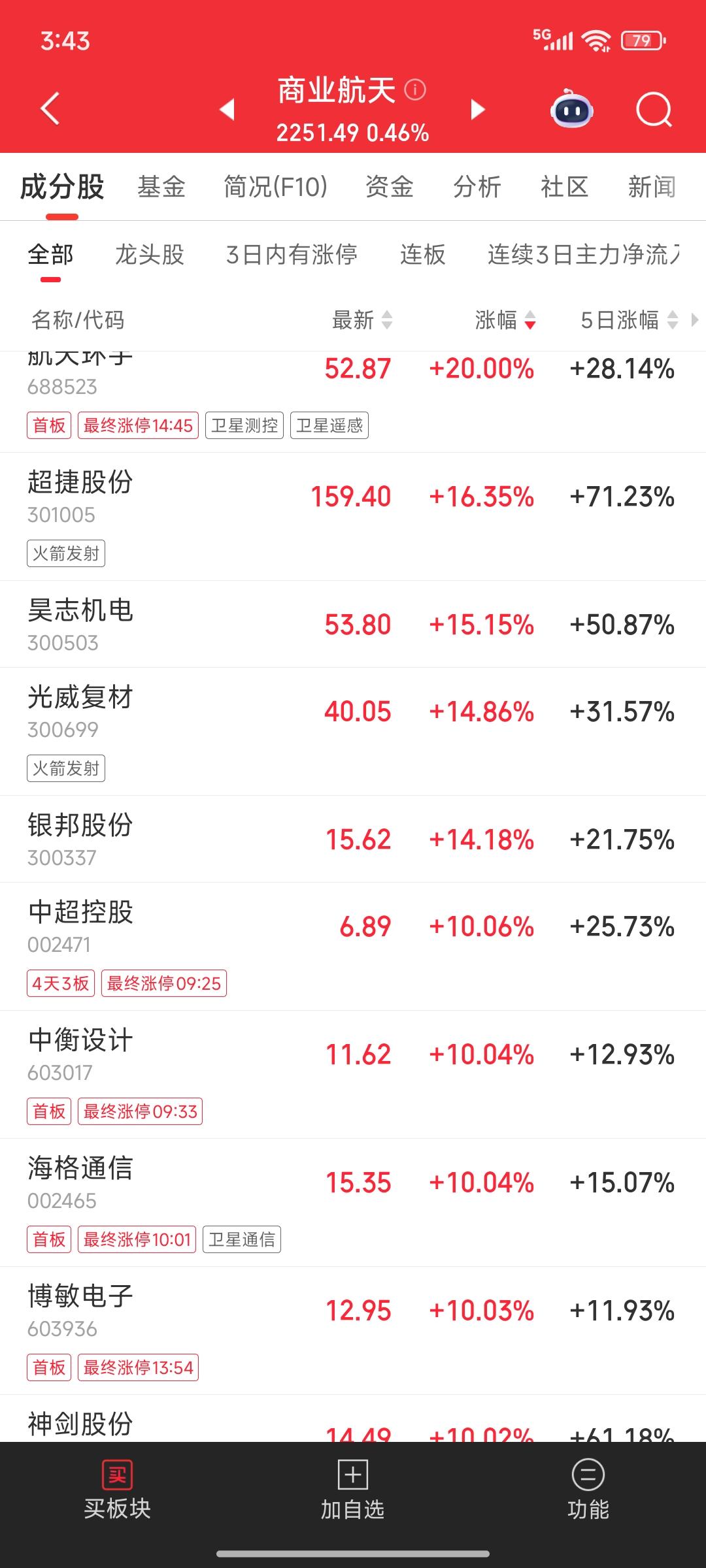 商业航天,大A今天最靓的仔 狂拽炫酷吊炸天呀 板块指数续创历史新高 整个板块的成交额超过四千亿 涨停个股足足有二十多个 把其他板块秒成渣了 有很多散户在里面吃到了大肉 真让人羡慕的流口水呀 之所以走的如此强势,就是因为利好持续发酵 话说回来,不要轻易去追高 除非你是高手,不然很容易挂在山顶