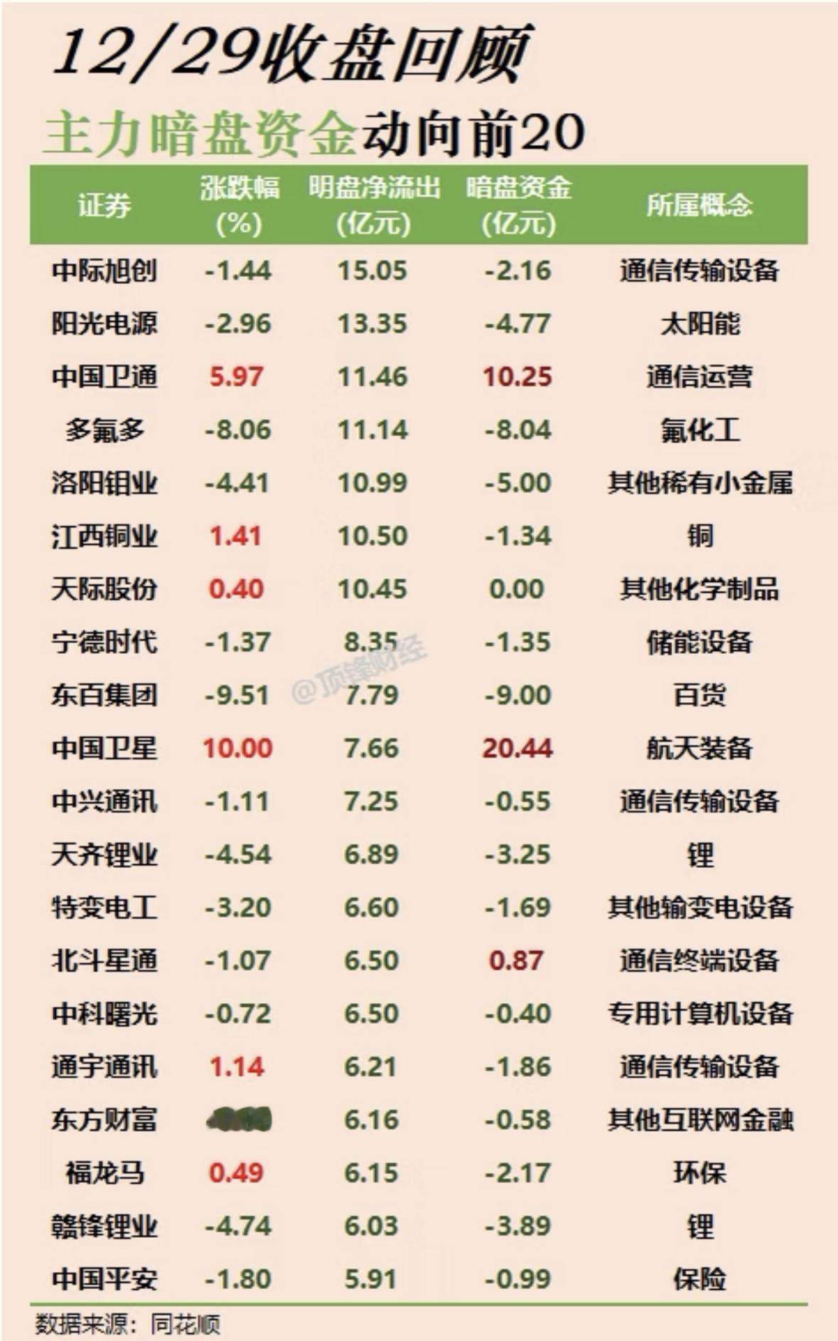 12/29主力暗盘资金动向前20,揭秘行业应用软件、芯片等热门概念股! 主力资金动向曝光: 拓维信息领涨软件板块,寒武纪芯片受捧, 航天装备与汽车零部件活跃, 风能、太阳能概念股走