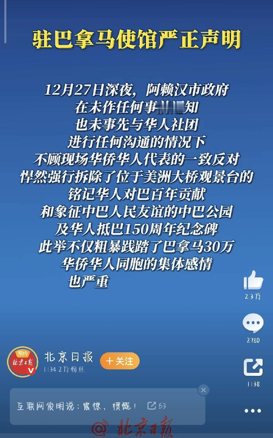 近日,巴拿马阿赖汉市政府的一项行动引发广泛愤慨——12月27日深夜,在未作任何提前通知、也未与当地华人社团协商的情况下,该市政府不顾现场华侨华人的劝阻,强行拆除了位于美洲大桥观景台的中巴公园及华人抵巴150周年纪念碑。此举不仅深深伤害了巴拿马约30万华侨华人的感情,也让中国人民倍感痛心。中国驻巴拿马大使馆已正式表态,对此表示极度震惊与强烈愤慨。 这座公园和纪念碑为何如此重要?故事要追溯到171年前。当时,第一批华人远渡重洋来到巴拿马,与当地民众共同投身两洋铁路建设,许多人付出生命,长眠于运河沿岸。此后,华人在这片土地上扎根奋斗,早已成为巴拿马国家发展进程中不可或缺的力量。为肯定华人的贡献,巴拿马政府于2004年正式设立每年3月30日为“华人日”。同年,在华人社团筹资与中国政府资助下,中巴公园和纪念碑落成,既为纪念华人抵巴150周年,也是两国友谊的象征,成为双方共同珍视的精神遗产。 事实上,华人社团早已关注公园的维护问题。自2024年起,他们多次与阿赖汉市政府沟通,并在今年获悉可能拆除的消息后,主动提出愿出资修缮改造,然而这些努力始终未获回应。中国驻巴使馆亦曾表达协助翻修的意愿,同样未被重视。 阿赖汉市政府事后解释称,拆除是由于建筑存在“结构性安全风险”,系出于安全考虑。但这一说法难以服众——华人代表指出,今年3月已提交翻新方案,此后未收到任何回复,为何突然选择在深夜强行拆除?巴拿马总统穆利诺亦公开斥责此举是“毫无正当理由的野蛮行径”,强调完全不可接受。 值得欣慰的是,事件仍存转机。12月28日,巴拿马总统府及多个政府部门发表声明,明确谴责阿赖汉市政府的做法,并下令在原址尽快修复纪念碑,要求与华人社团及文化部密切协调。中国外交部也已表态,对强行拆除行为表示严重不满,已向巴方提出严正交涉,要求彻底调查、纠正错误。 目前各方的诉求十分明确:一是彻底查清拆除事件,依法依规追究责任;二是在原址重建中巴公园和纪念碑,且必须与华人社群充分协商。这并非普通的建筑物,而是承载百年历史记忆与两国友谊的精神载体。尊重它,即是尊重历史,也是致敬那些为巴拿马发展挥洒汗水、奉献青春的华人先辈。期待此事早日得到妥善解决,不让这份珍贵的情谊蒙上阴影。 来源:北京日报