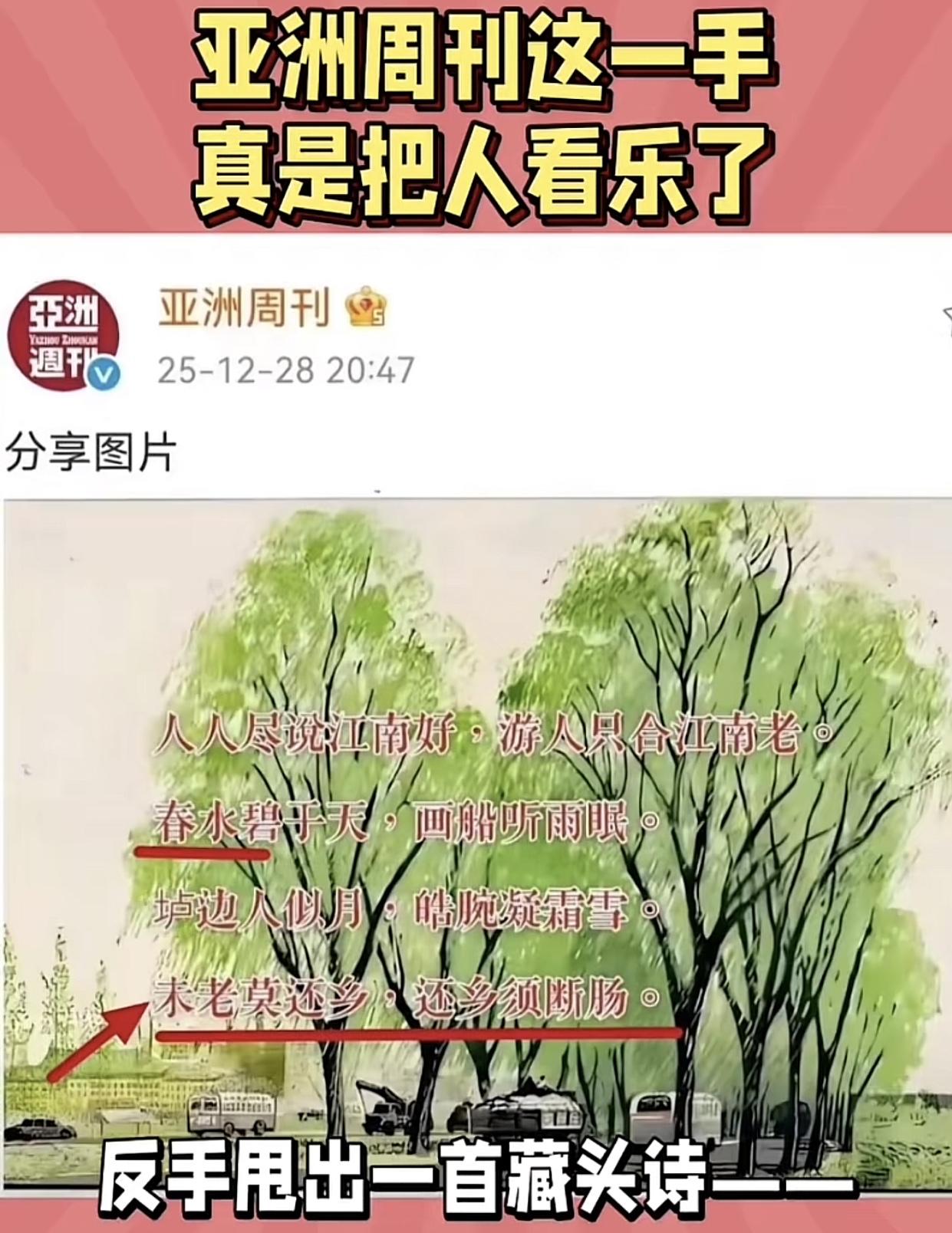 文化人这波操作, 我真看服了! 南博那幅仇英《江南春》的事,太有意思了! 这幅画是庞家无偿捐的,早年被鉴定成仿作,低价转出去了。现在市场估值涨了好多,还疑似出现在交易里,反差超大! 更绝的是《亚洲周刊》,相关内容被处理后,没吵没闹,反手发了首唐诗——钱起的《省试湘灵鼓瑟》。 全诗一个字没改,也没加任何解释,网友一扒才发现,每句首字连起来,谐音解读就是“春画未还”,明晃晃追问这幅画的下落! 我真服这种操作! 表面给足台阶,不碰调查红线,实际把该问的都问透了。 现在调查的人已经进驻,相关人员配合调查,庞家后人也盯着进展。 在我看来,这事不只是一幅画的去向,更关系到文物捐赠的信任底线。 咱就等个官方结果,看看这幅画背后还有啥细节!