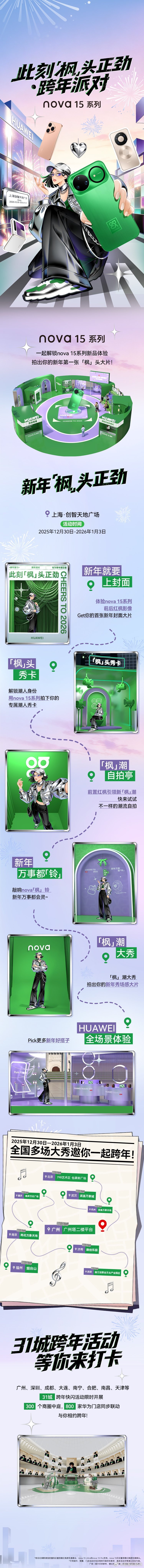 nova15枫头正劲华为nova15 系列此刻「枫」头正劲·跨年派对即将空降上海创智天地广场!更有全国多场跨年派对,31城跨年快闪,不见不散!nova15枫头正劲
