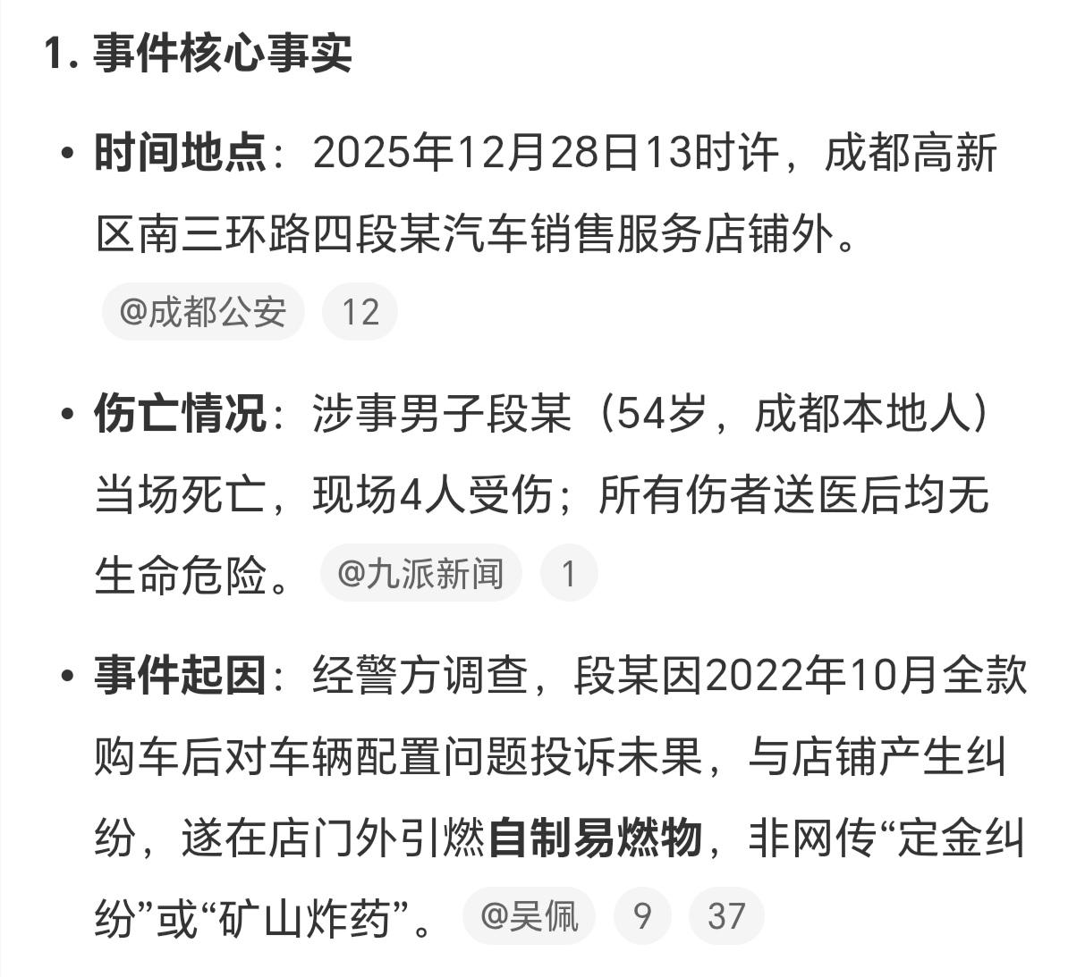 12月28日下午,成都一汽车4S店发生一起燃爆事件。造成当事人死亡,4人受伤。 看图4伤者,看穿着应该是一个店方工作人员。 这也太不值当了,三年前(2022年10月全款购车后,对车辆配置问题投诉未果,与店铺产生纠纷)的事,现在还在处于戾气中,并自制易燃物引爆,把自己给送走了。 像这种纠纷,上法院也不一定能解决。就算是诉诸法律了,得到的结果也不一定是自己想要的。 吃了闷亏,不和自己和解,也不给自己留一条后路,对方也无所谓,大家都干耗着,无解。 结果就是伤人800,自损100000000+。