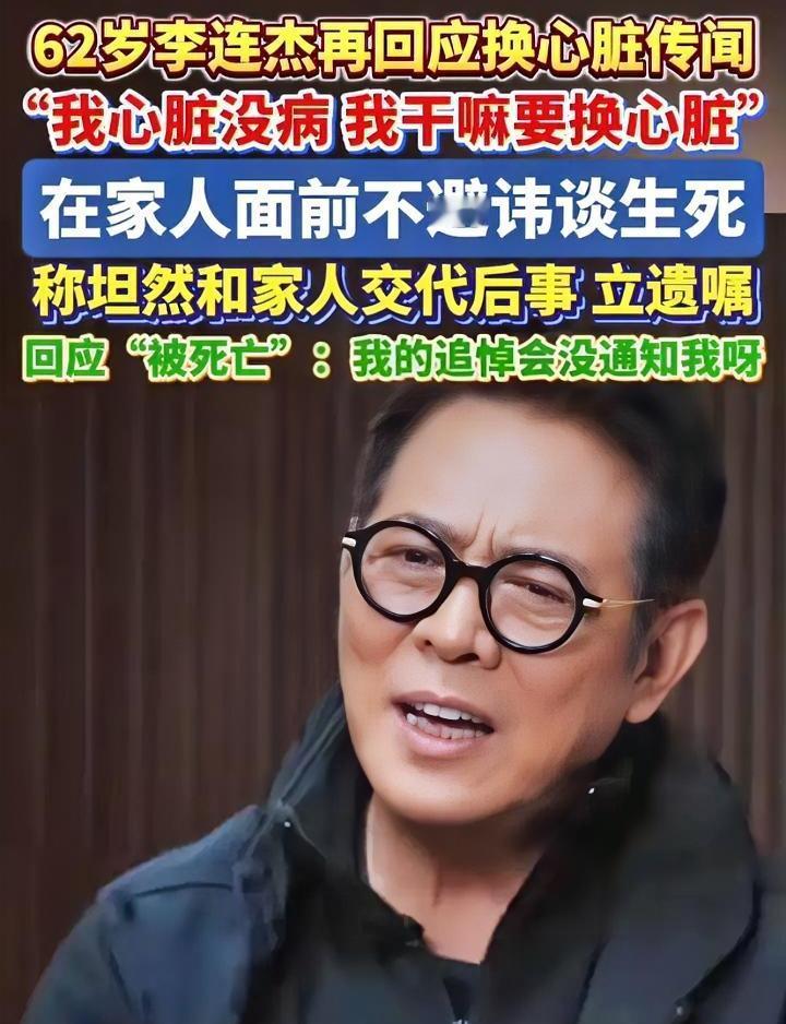 都把功夫巨星难为成什么样了 李连杰再次辟谣“换心脏”之说:“我心脏又没病,干嘛要换心脏”? 这么一他的状态也没啥奇怪的,李连杰不过才62岁,普通人这个岁数也不至于老的太明显,身体也都挺硬实的,很何况从小练武术的人?