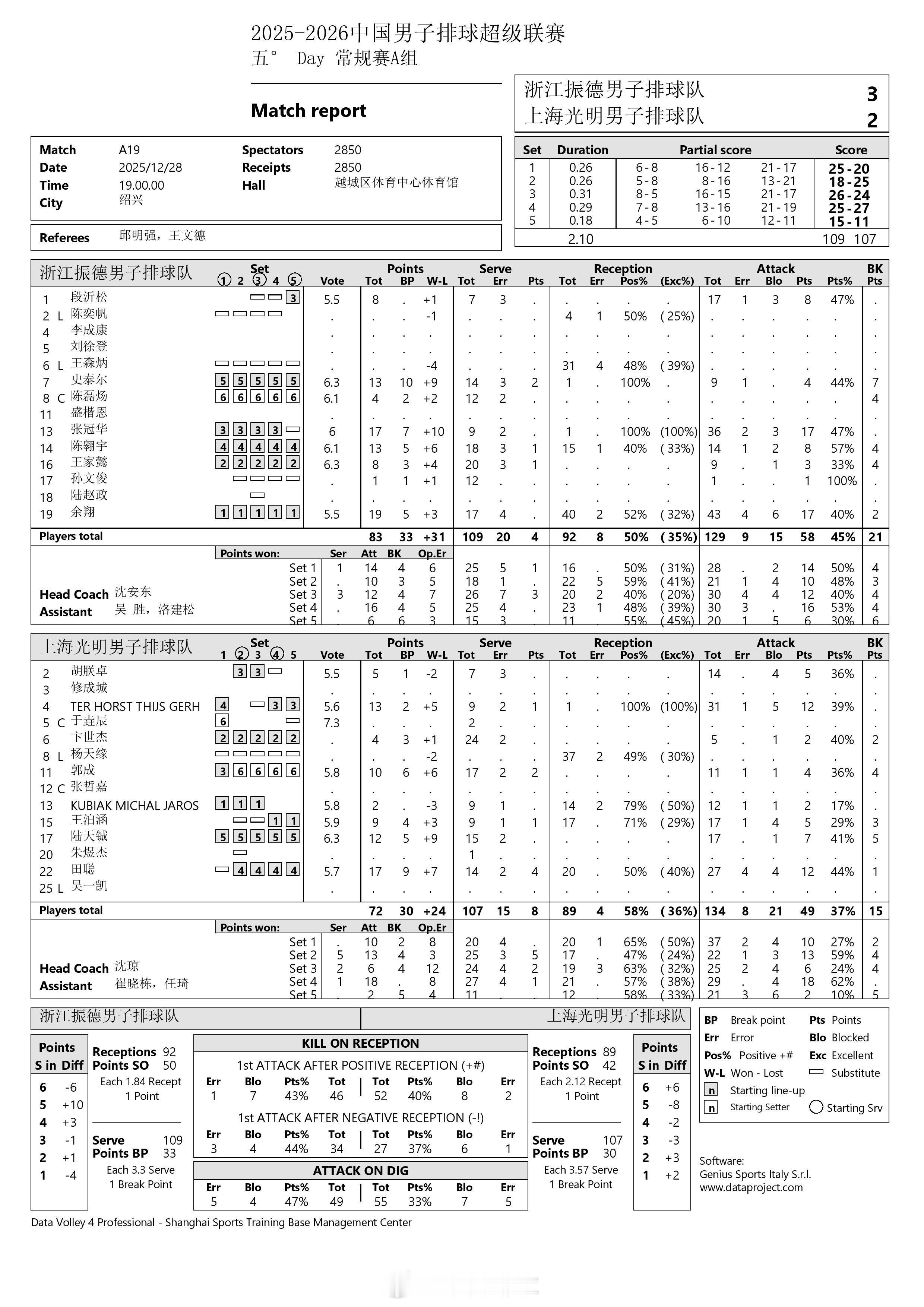 【中国男排超级联赛 浙江3-2上海得分统计】28日晚上,A级第5轮,浙江振德在主场以3-2(25-20, 18-25, 26-24, 25-27, 15-11)战胜上海光明。余翔19分(43扣17中、拦2),张冠华17分(36扣17中),陈翱宇13分(14扣8中、拦4发1),史泰尔13分(9扣4中、拦7发2),段沂松、王家懿各8分;田聪17分(27扣12中、拦1发4),特霍尔斯特13分(31扣12中、发1),陆天铖12分(17扣7中、拦5),郭成10分(11扣4中、拦4发2),王泊涵9分(17扣5中、拦3发1)。扣球58-49、拦网21-15、发球4-8、对手失误26-35。