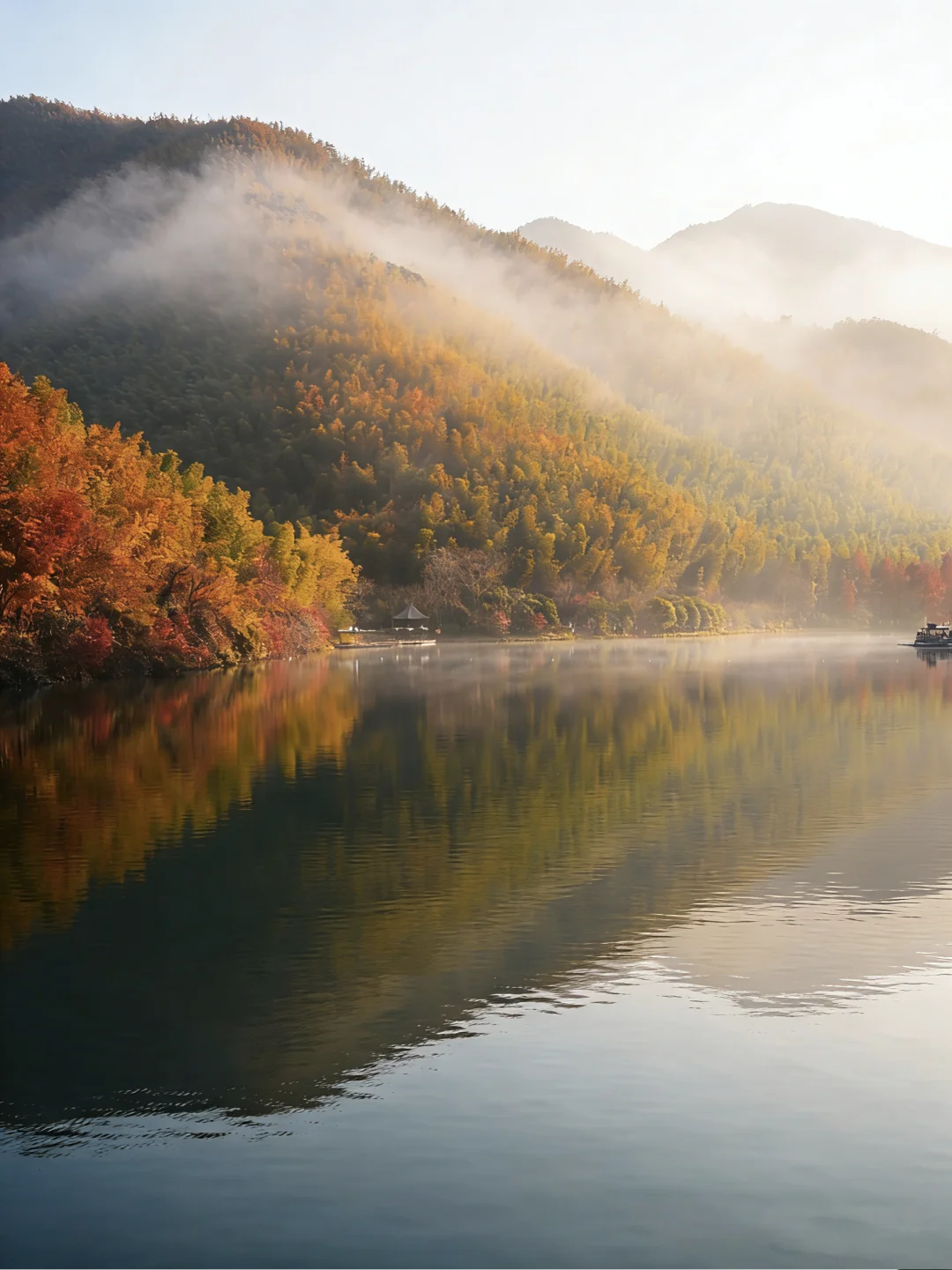 初冬的薄雾像一层柔软的纱,轻轻覆上山林