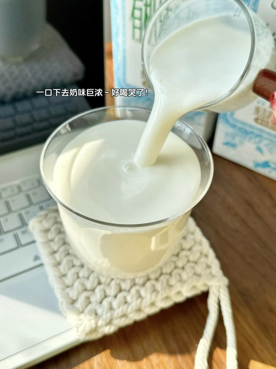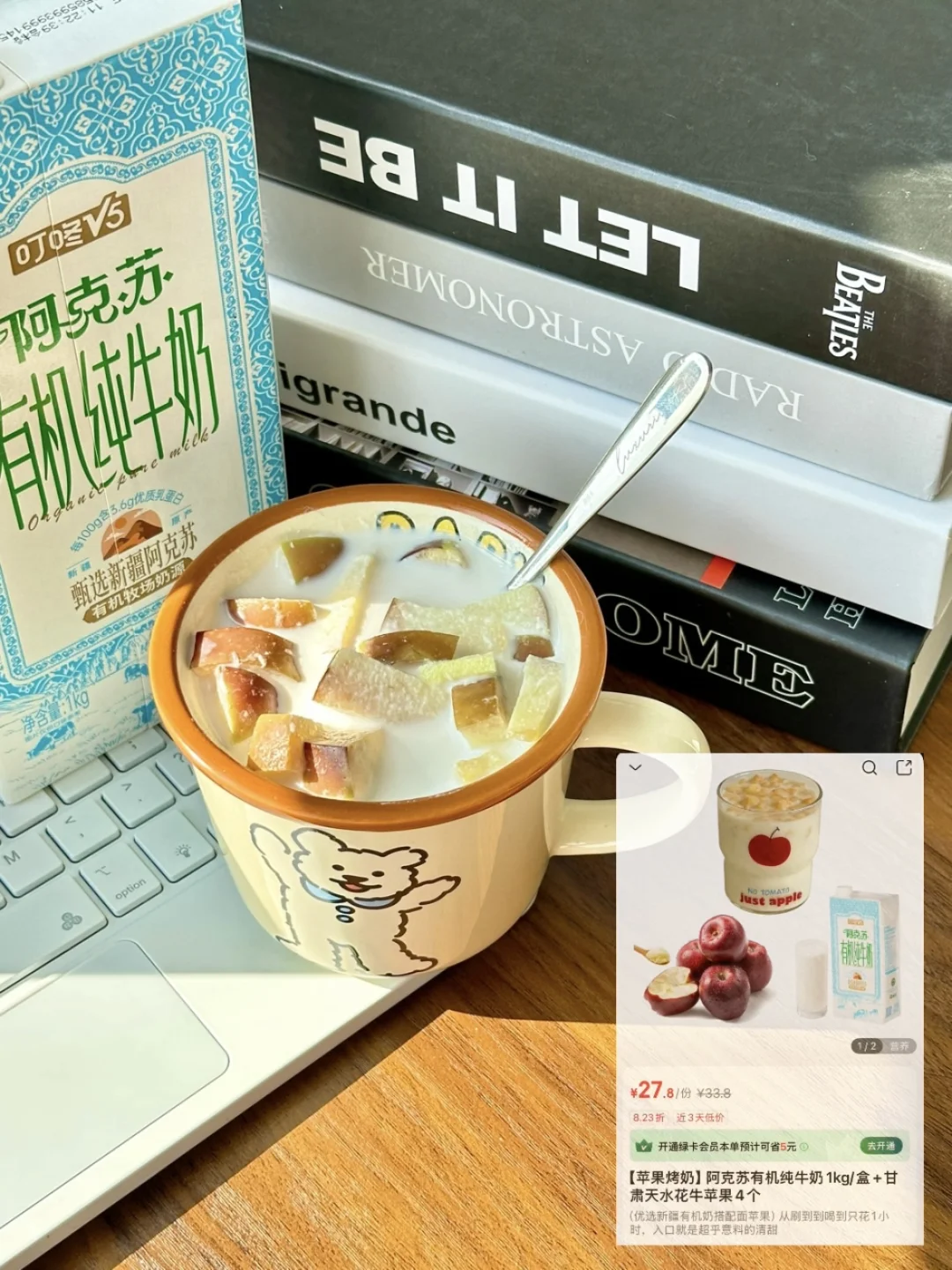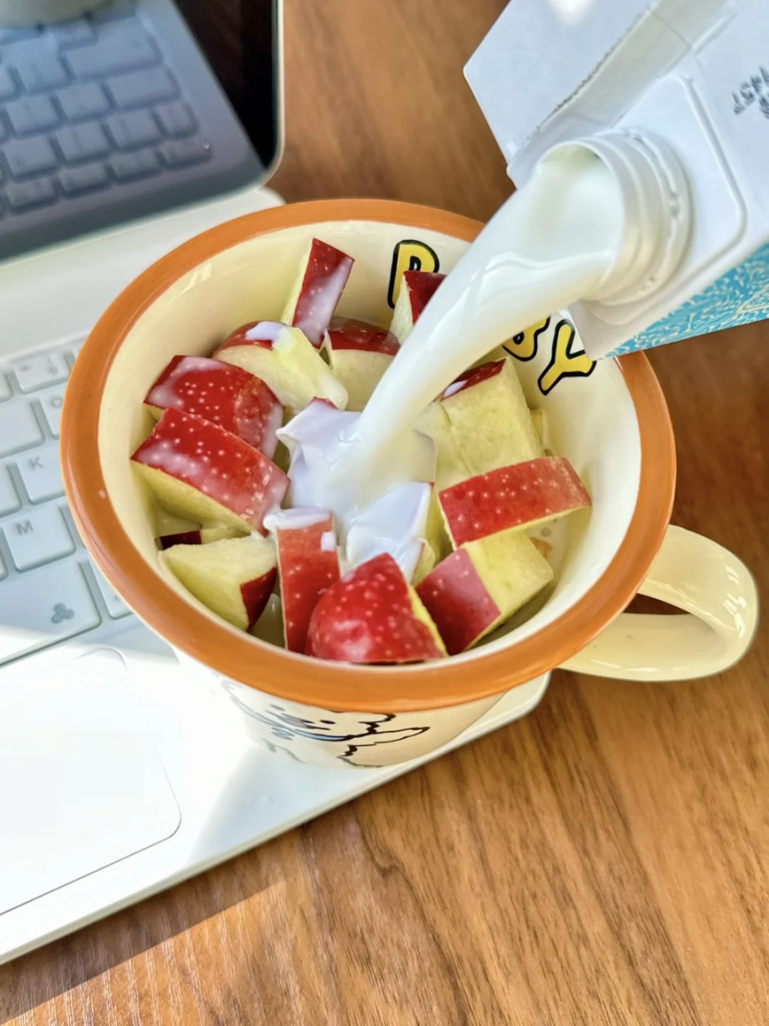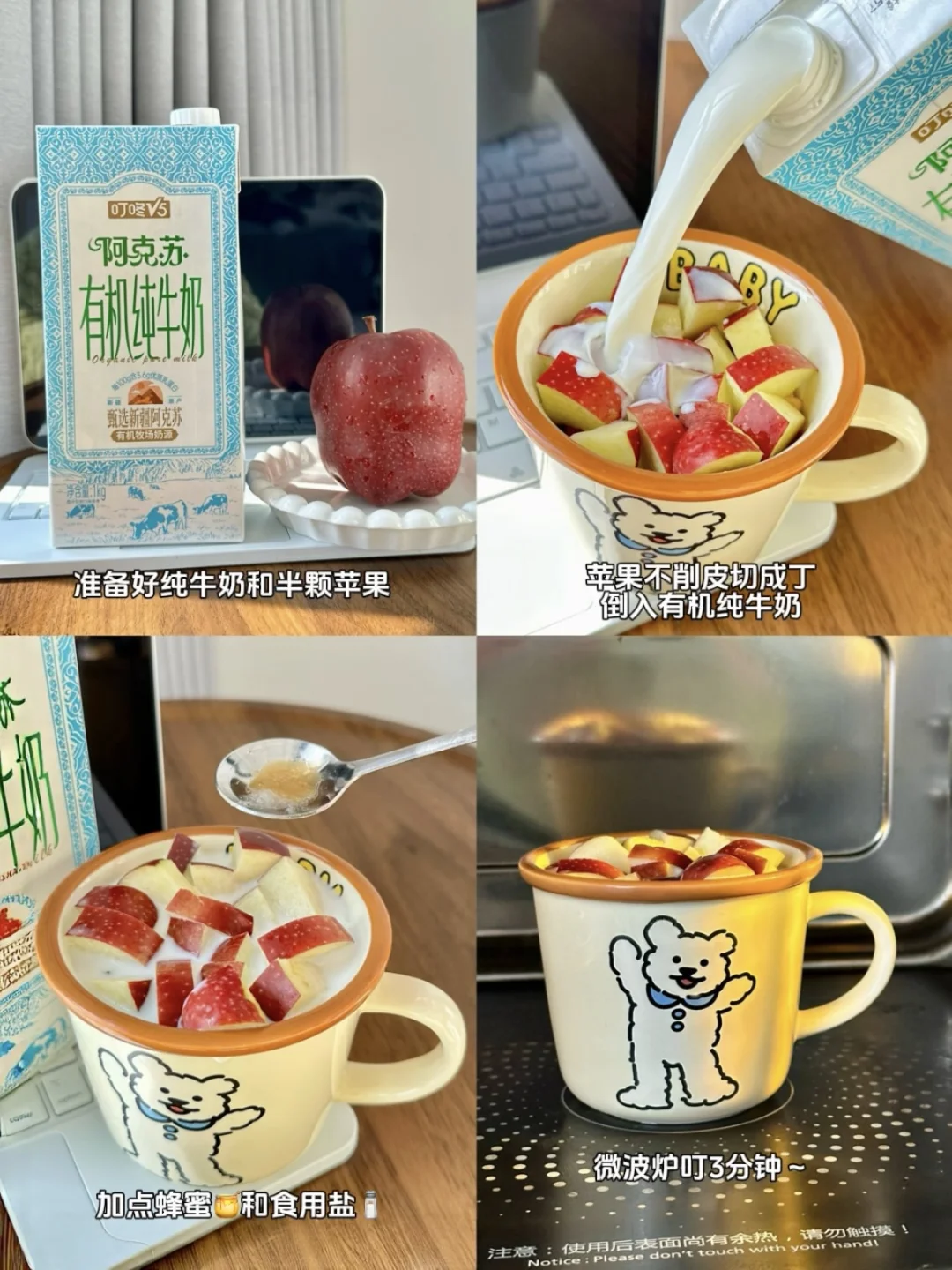 🥛搭配的新疆阿克苏有机纯牛奶,奶香味特别浓郁,丝滑到像在喝云朵,加热后完全没有腥气,还带着淡淡的回甘。刚好能衬出苹果的清甜。